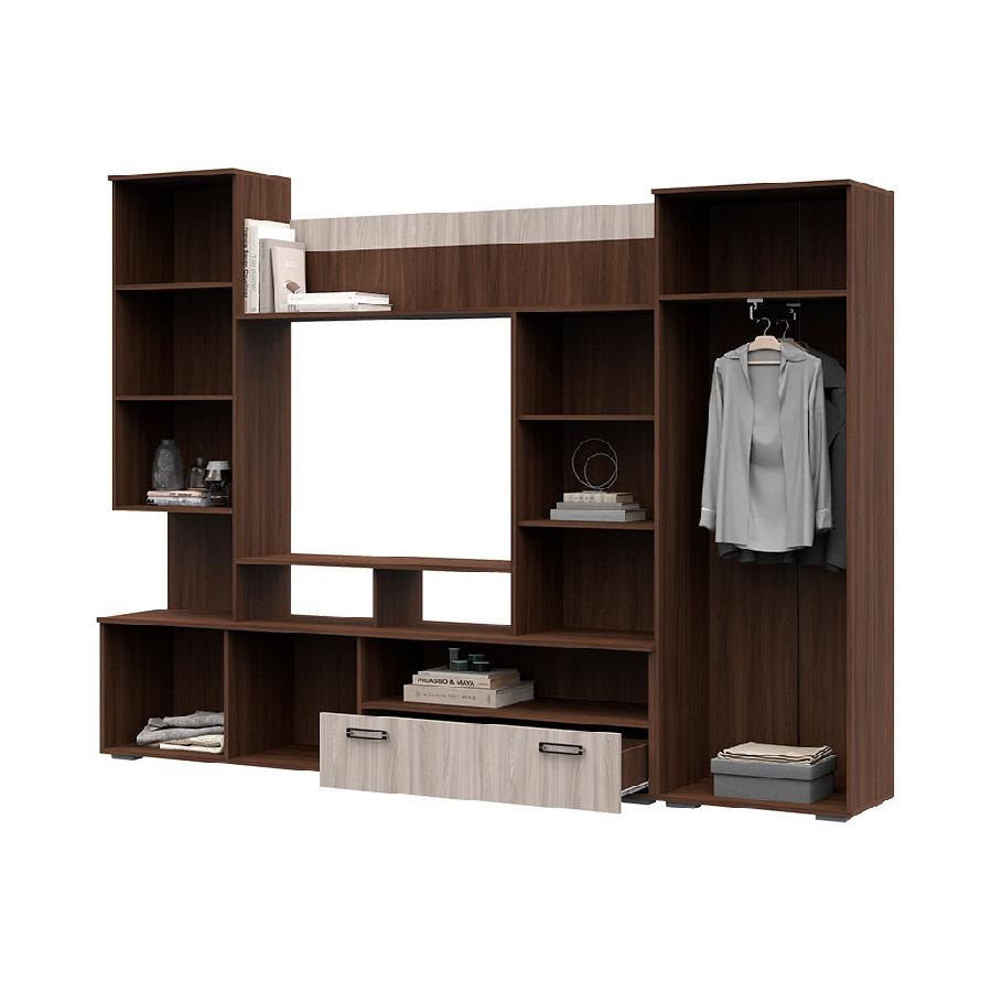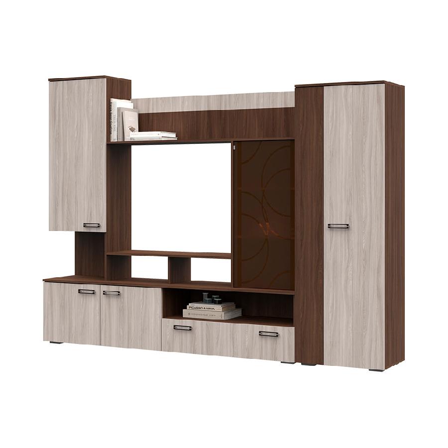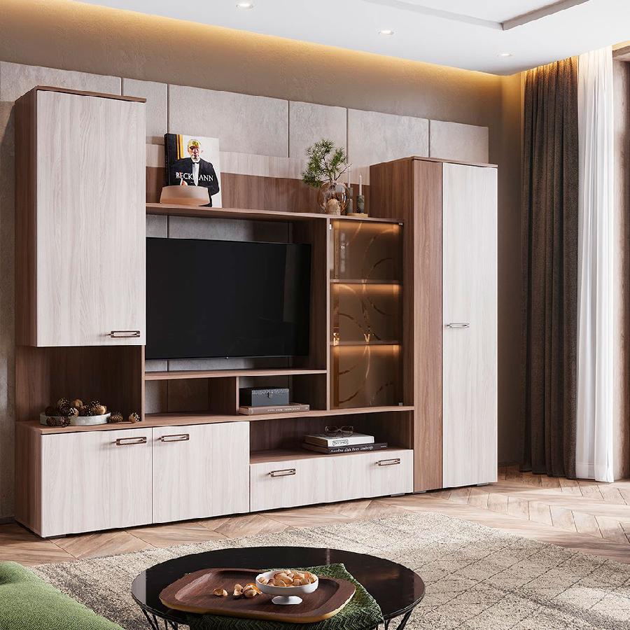 Гостиная "СИЕНА" включает в себя сервант для посуды, шкаф с полками закрытый, тумбу для телевизора и шкаф платяной с полкой и штангой.