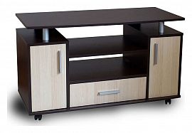 Стильная и практичная тумба для размещения телевизора и сопутствующей техники. Под столешницей две открытые полки, в центре выдвижной ящик, слева и справа ниши с полками и распашными дверцами.