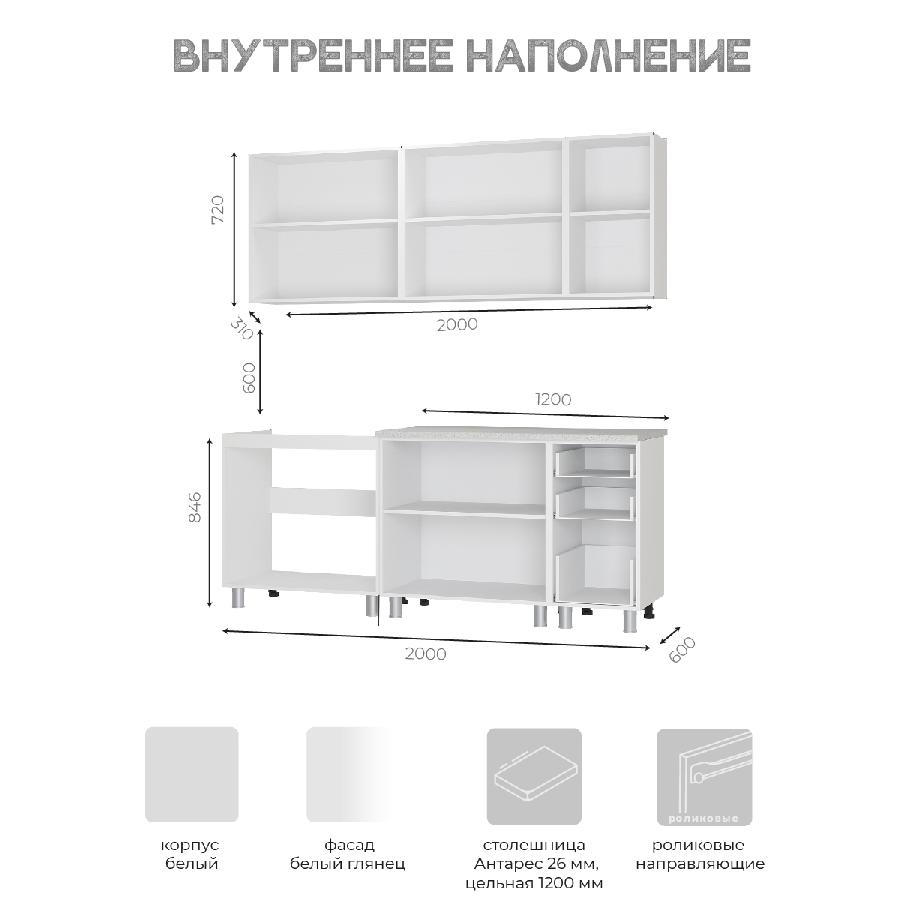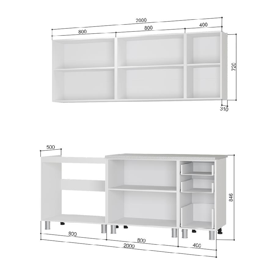 Габаритные размеры композиции нижних модулей с учётом столешницы: ширина: 2000 мм; высота: 846 мм; глубина: 600 мм.