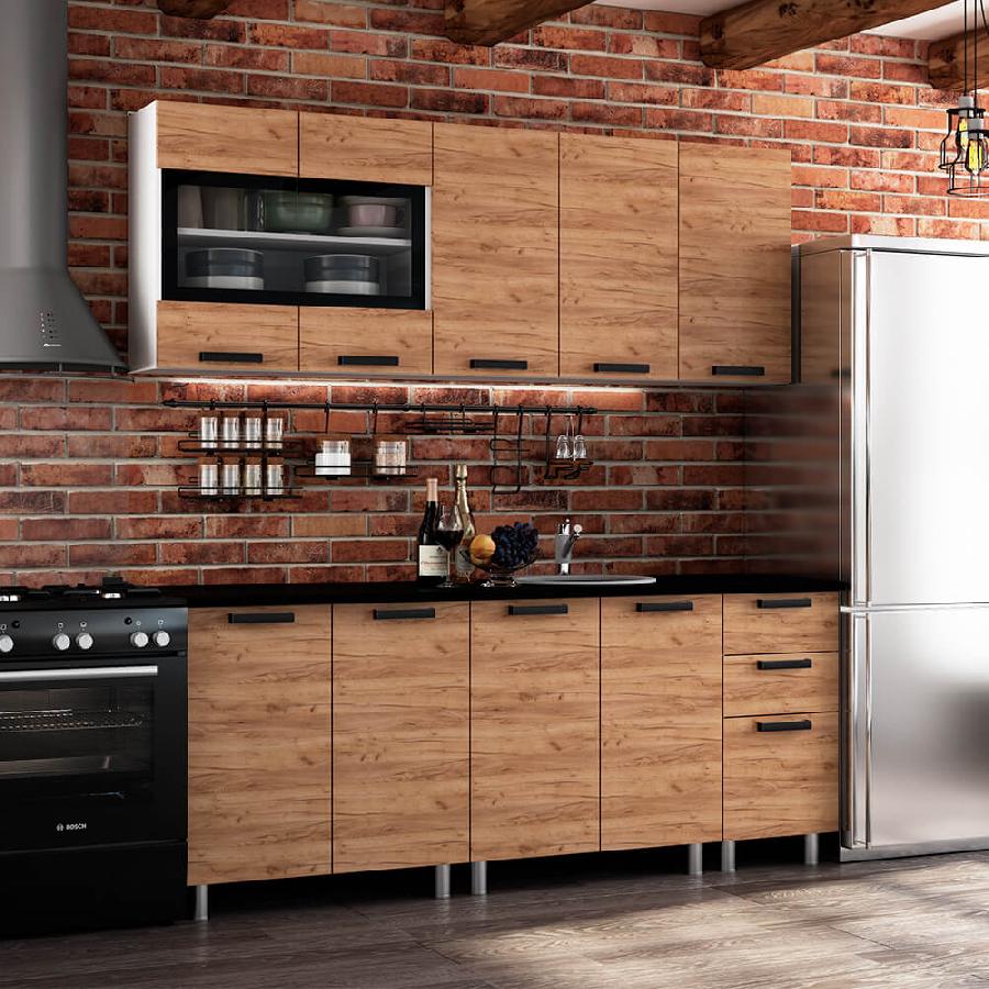 Модель оснащена всеми необходимыми нишами и полками для комфортного размещения посуды и продуктов; выполнена из высококачественной ЛДСП с фасадами в цвете дуб крафт золотой и дополнен стильными черными ручками; часть верхних шкафов имеют стеклянные вставки, что облегчает всю конструкцию.