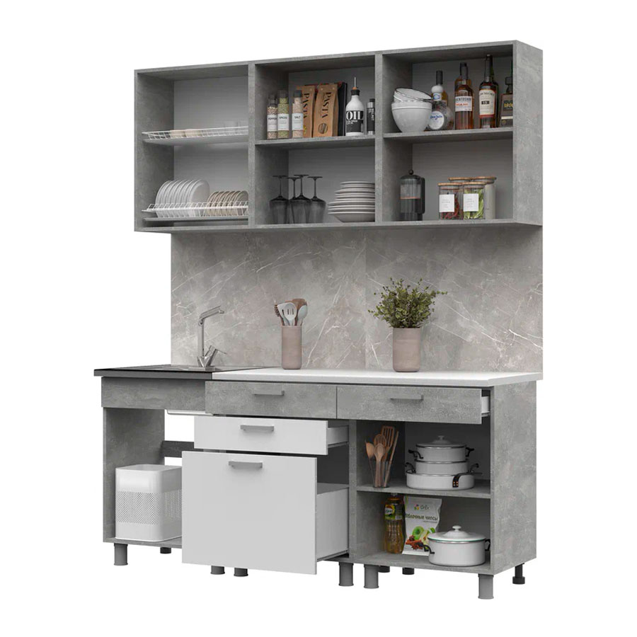Кухня укомплектована наборной столешницей декора "Антарес" 26 мм. Каждый элемент столешницы закромлен по периметру, обеспечивая защиту в агрессивной влажной среде.
