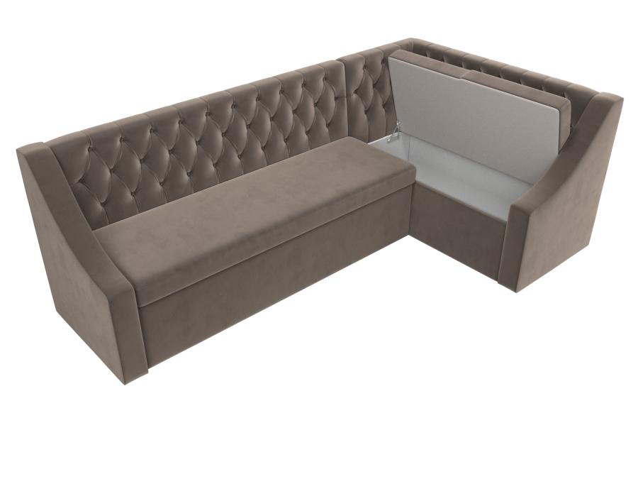 Мерлин – угловой кухонный диван хорошего качества по доступной цене. Он отлично подойдет для дополнения кухни в малогабаритной квартире. Высокая спинка, украшенная каретной стяжкой, снимет напряжение с позвоночника. Подлокотники помогут расслабить руки. Сиденье легко превращается в полноценную кровать. Дополнительную выгоду обеспечивает вместительный ящик размером 117х35х57 см под угловым сиденьем.