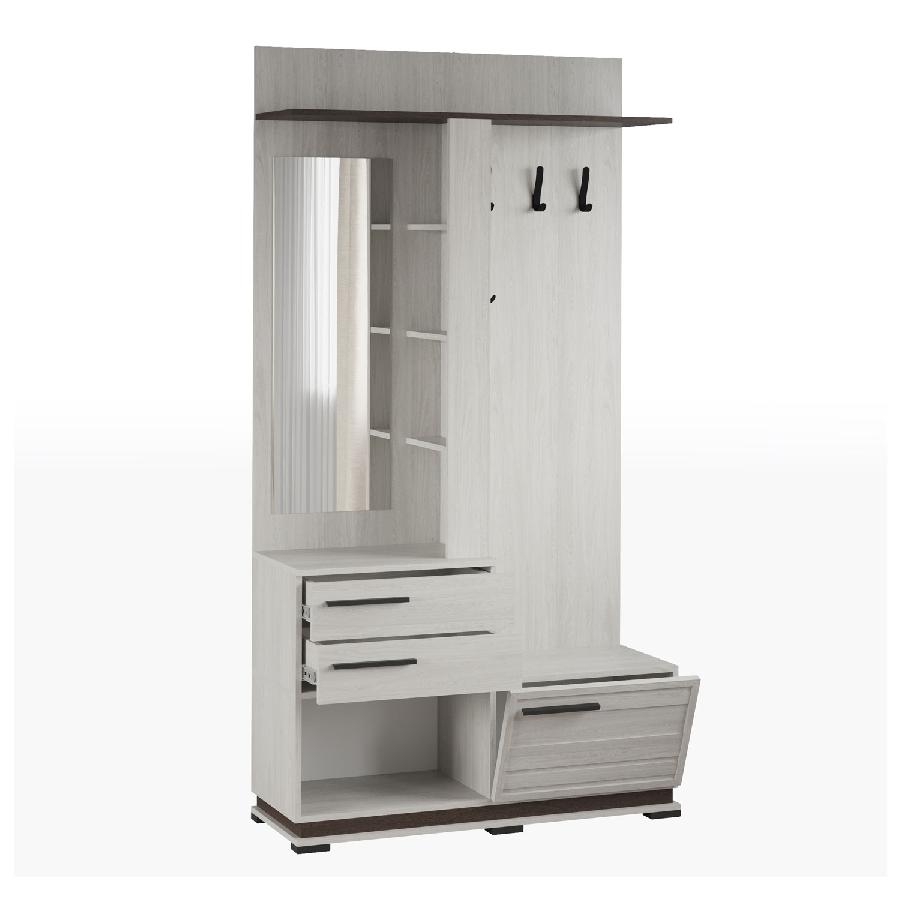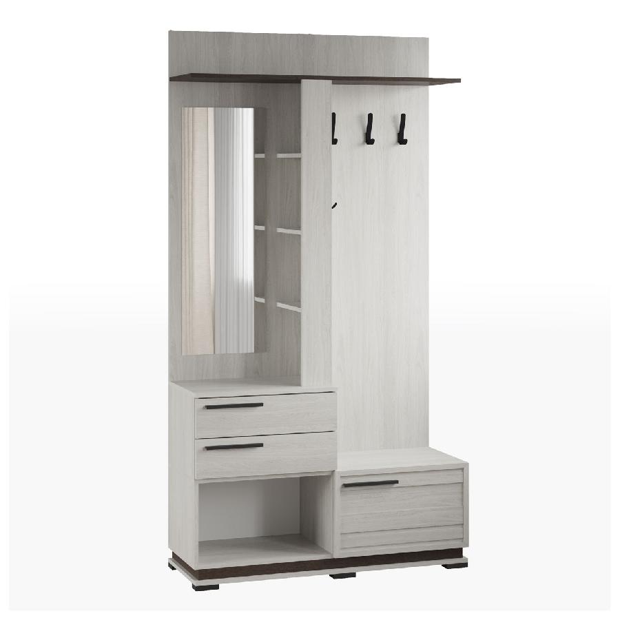Прихожая Модена отлично подойдет как самостоятельный элемент в качестве решения для малогабаритных условий, так и в составе комплекса интерьера для вашей прихожей. Она включает в себя секцию для верхней одежды с крючками и полкой для головных уборов, ящик с откидной барной дверцей, открытую нишу для обуви и два выдвижных ящика. Фасад украшает большое зеркало, чтобы вы могли оценить свою внешность во время смены одежды.