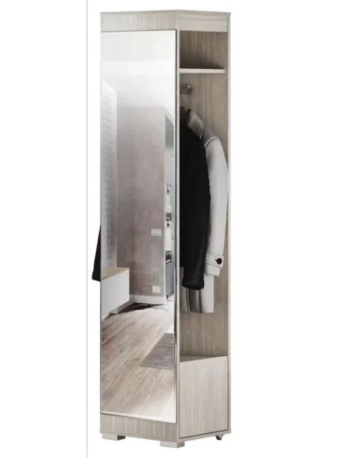 Изделие оснащено зеркалом во весь рост, штангой для верхней одежды, полкой для головных уборов и выдвижным ящиком, в котором можно хранить обувь или средства по уходу за ней, модель выполнена из ЛДСП в темном цвете венге.