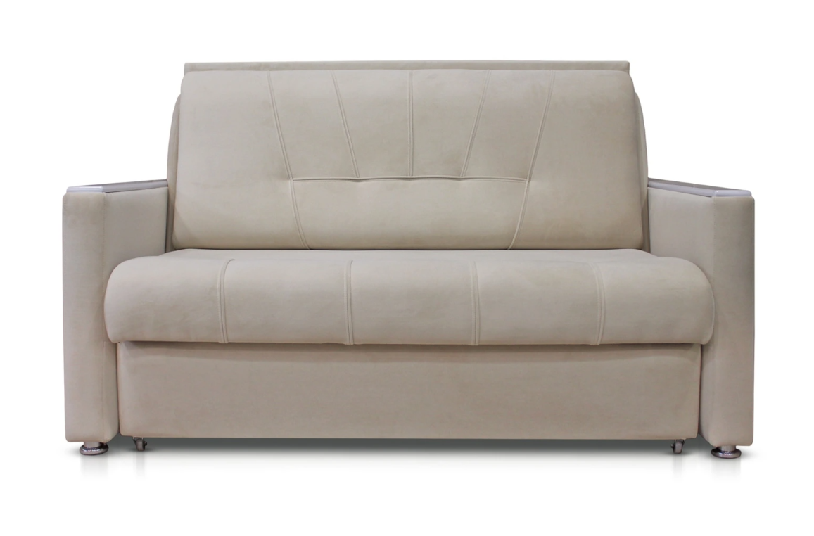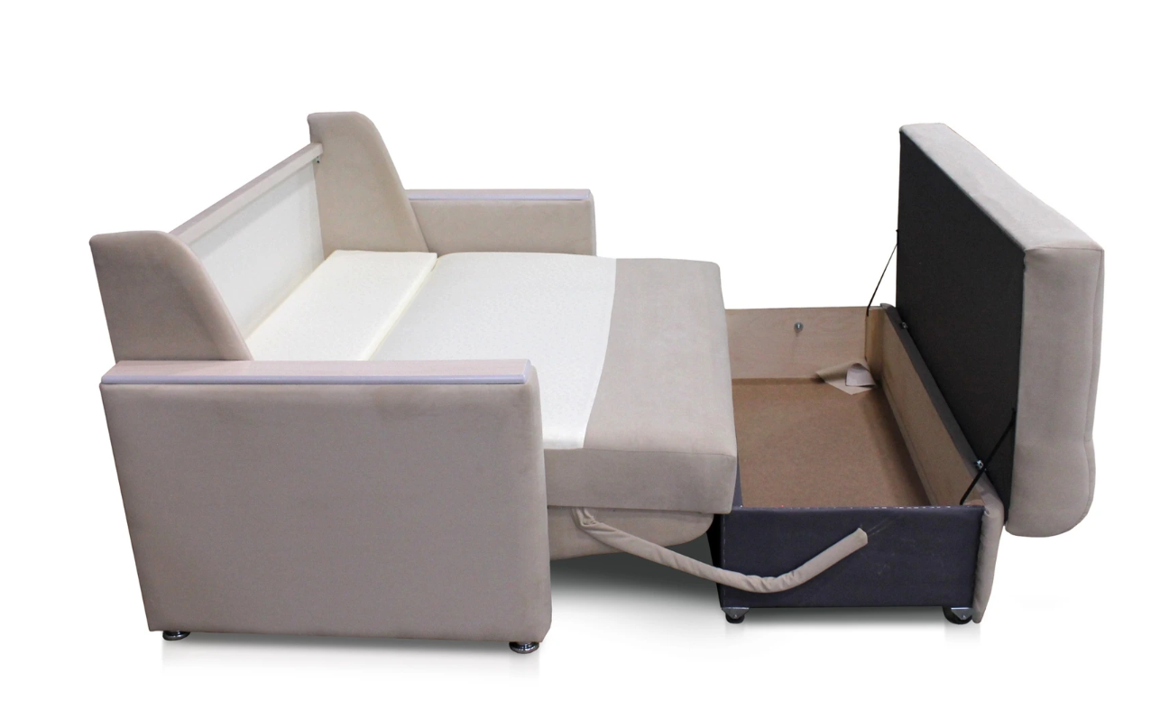 -Простая и надежная система трансформации "Дуги-кронштейны" . Разложить диван очень просто. Для этого нужно спинку дивана потянуть вниз, сиденье на прорезиненных колесиках выкатится вперед. Затем опустить подголовник. Диван-кровать готов к использованию;