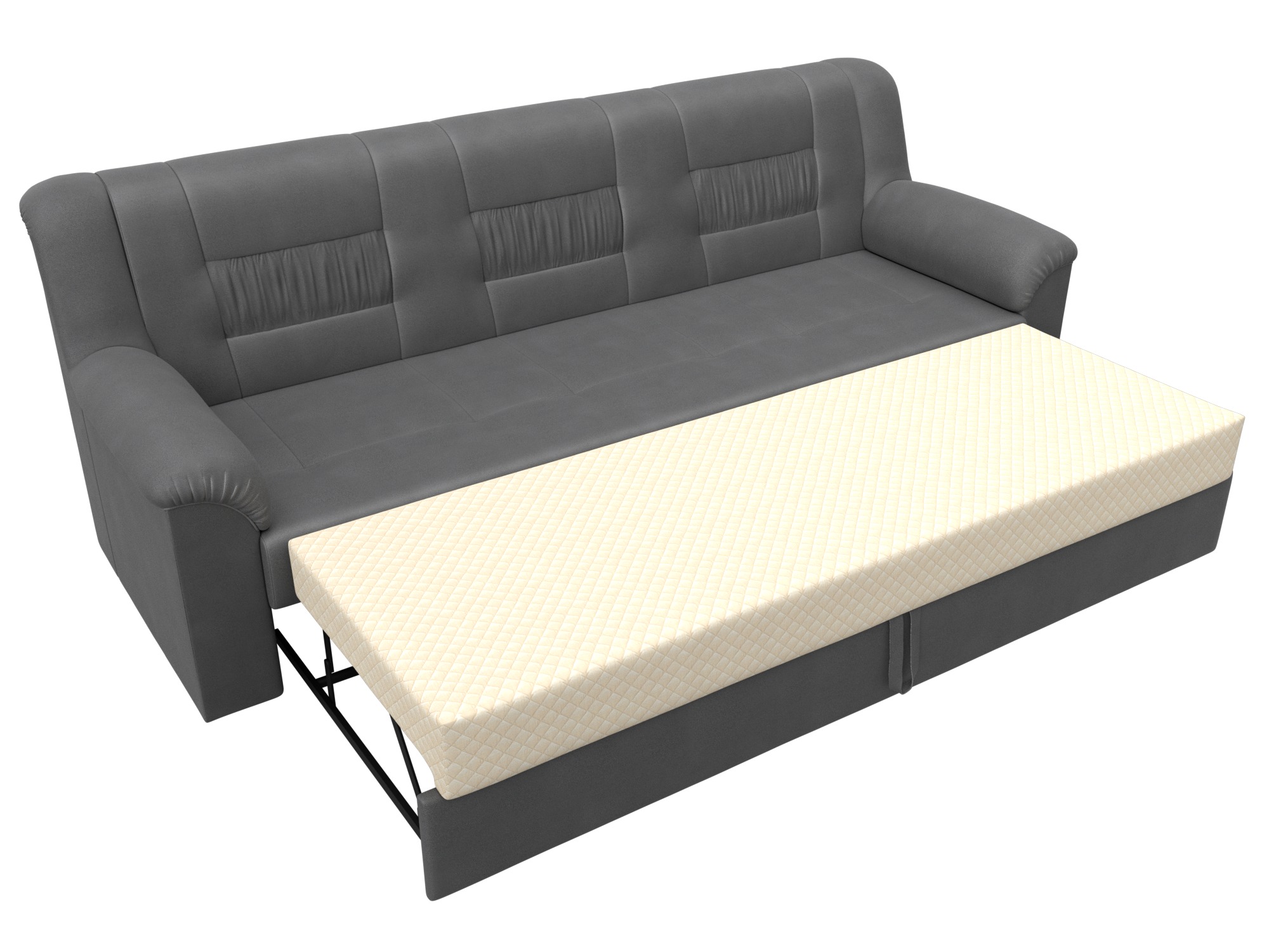 Механизм раскладки: дельфин. Надежная и долговечная система, состоящая из металлических кронштейнов и направляющих. Разложить прямой диван можно выдвинув вперед нижнюю часть сиденья. Из открывшейся ниши автоматически поднимется спальный блок.
