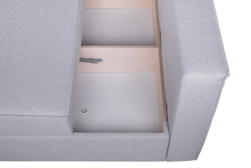 Двухместный модуль оснащён надёжным механизмом трансформации flip-out. Он прост в эксплуатации: одним движением диван превращается в комфортное спальное место на каждый день. Для хранения вещей и постельного белья в основании модуля расположены два вместительных ящика. Мы позаботились о вашем комфорте, ящики оснащены клапанами вентиляции, обеспечивающими циркуляцию воздуха и предохраняющими от появления запаха.