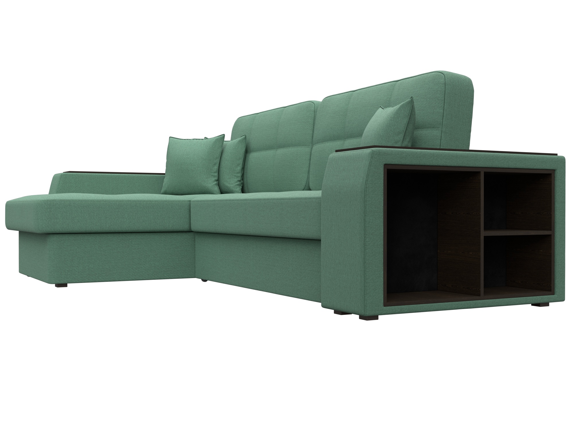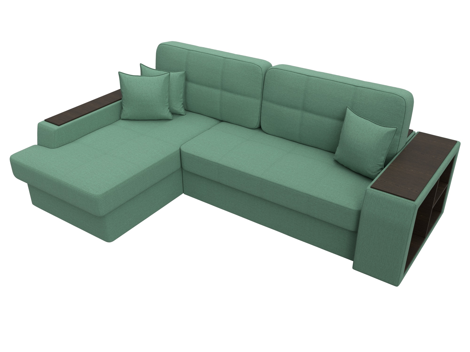 Шикарный угловой диван Брюссель удобен и функционален в использовании. Подлокотники выполняют роль мини-столиков. Одна из боковин дополнена книжными полками, декорированным «под дерево». Изделие оснащено удобным механизмом трансформации в двуспальную кровать.