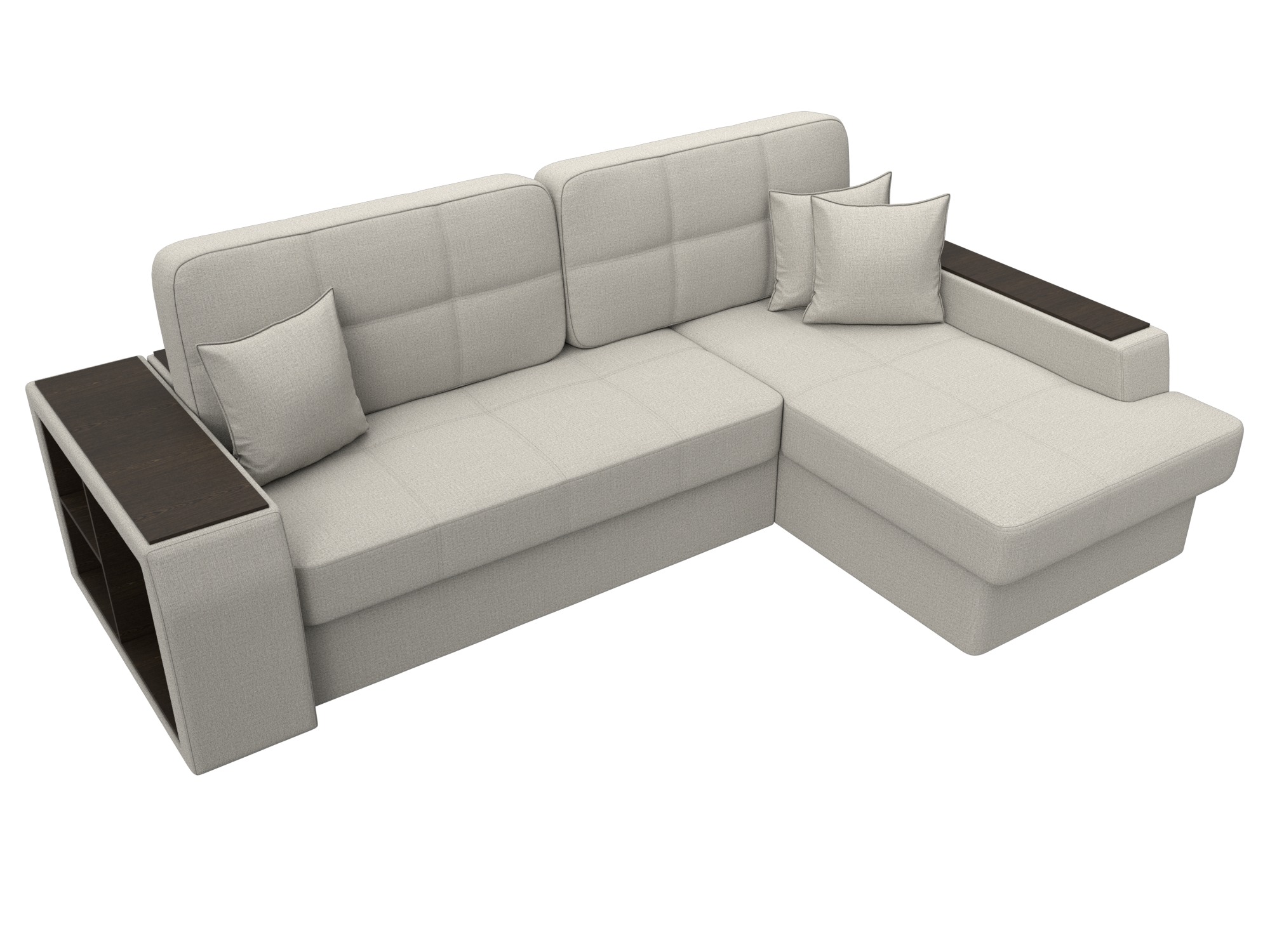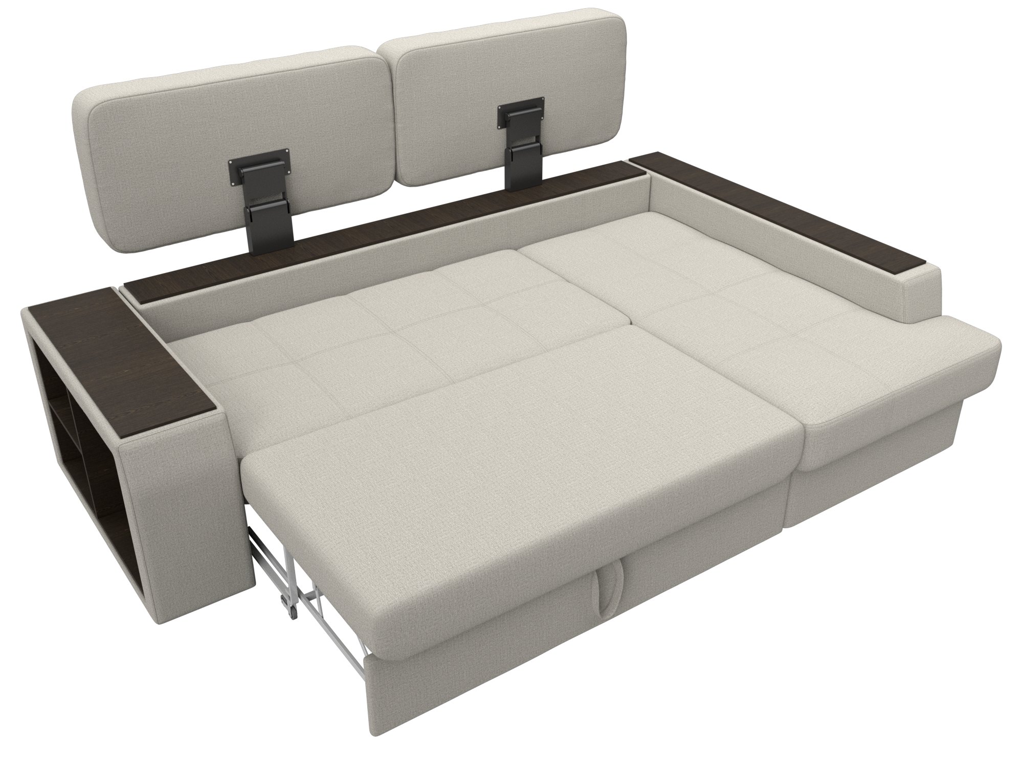 Шикарный угловой диван Брюссель удобен и функционален в использовании. Подлокотники выполняют роль мини-столиков. Одна из боковин дополнена книжными полками, декорированным «под дерево». Под длинной боковиной расположена ниша для белья. Изделие оснащено удобным механизмом трансформации в двуспальную кровать.