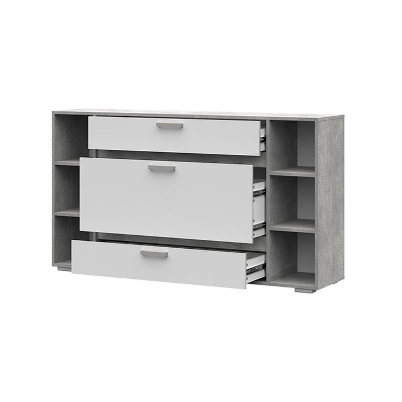 Дизайн комода Денвер КМ02 созвучен с линией серии и выполнен в том же светлом цвете сдержанных оттенков. Он предназначен для хранения вещей, белья и одежды и для этих целей снабжен тремя выдвижными ящиками, которые бесшумно двигаются на шариковых направляющих полного выдвижения, а также открытыми нишами по бокам, где вы можете оставить вещи, нужные для быстрого доступа.