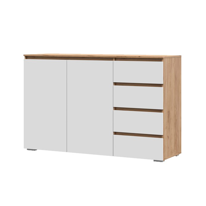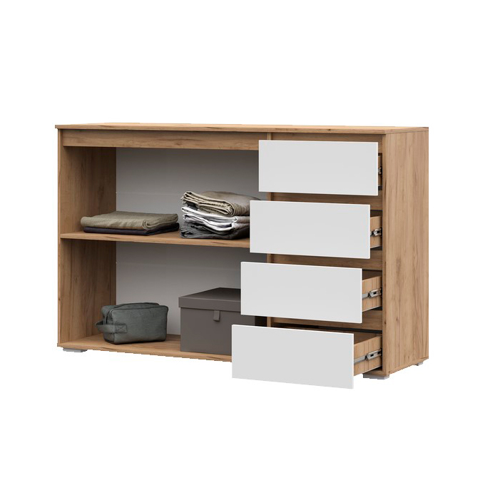 Комод Хелен КМ 06 – замечательная модель для обустройства детской, спальни или гостиной. Система хранения разделена на два закрытых отсека: 4 выдвижных ящика справа и тумба с одной полкой ЛДСП слева. Дизайн модели спроектирован мининималистично, на фасаде отсутствуют ручки, функцию ручек выполняет удлиненный фасад.