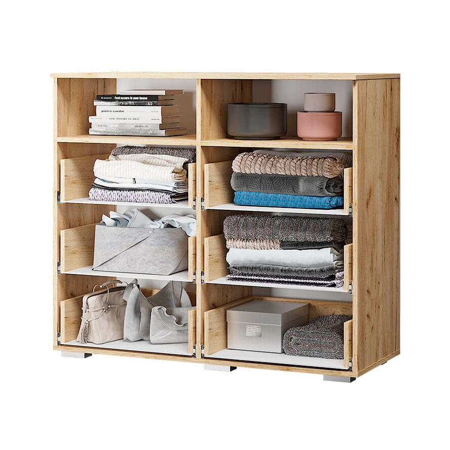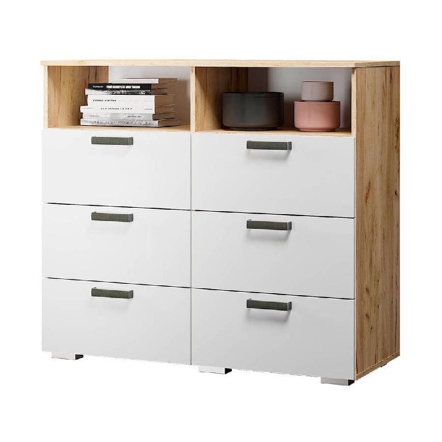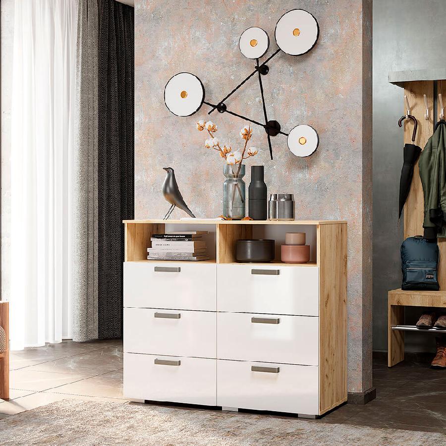 Наличие шести выдвижных ящиков позволит разместить большое количество вещей, на двух открытых полках можно хранить технику или книги, комод Азаро выделяется белыми глянцевыми фасадами и эргономичными хромированными ручками на фоне корпуса в цвете венге.