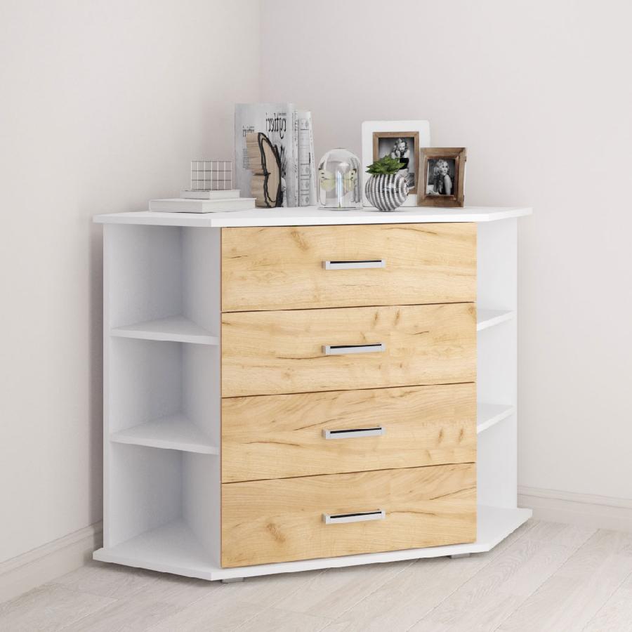 Угловой комод с открытыми полками и выдвижными ящиками.