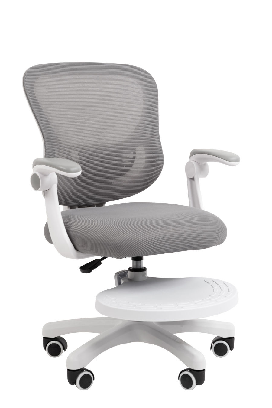 Сетчатая спинка и мягкое сиденье обеспечивают удобную посадку. А подставка для ног – правильное положение ног: под углом 90 градусов в коленях и фиксацию полной стопой. Откидные подлокотники создают дополнительный комфорт и экономят пространство – когда кресло не используется, его можно полностью закатить под стол. Регулировка высоты сиденья адаптирует детское кресло под рост ребенка.