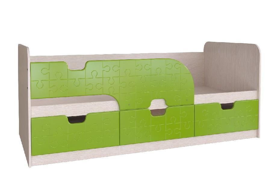 Дизайн модели предусматривает защитный бортик, который обеспечит безопасность во время сна, наличие трех выдвижных ящиков позволит хранить в них игрушки или постельное белье, отсутствие ножек облегчит вам уборку, так как под основанием не будет скапливаться пыль, фасады ящиков и бортика выполнены в цвете лайм и имеют фрезеровку в виде деталей пазла.
