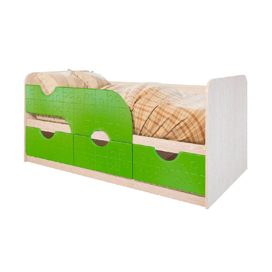 Дизайн модели предусматривает защитный бортик, который обеспечит безопасность во время сна, наличие трех выдвижных ящиков позволит хранить в них игрушки или постельное белье, отсутствие ножек облегчит вам уборку, так как под основанием не будет скапливаться пыль, фасады ящиков и бортика выполнены в цвете лайм и имеют фрезеровку в виде деталей пазла.