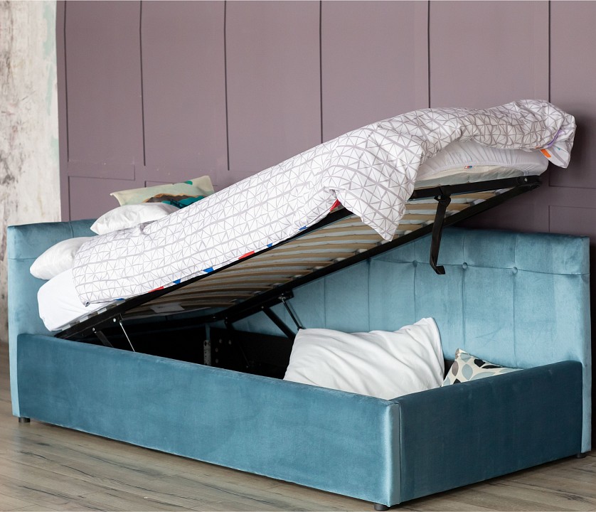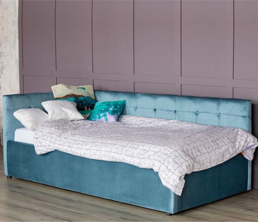 Односпальная кровать Bonna – уникальный предмет мебели, который совмещает в себе полноценную кровать и диван. Кровать с двумя мягкими спинками выполнена из модной мебельной ткани – велюр. Ткань износостойкая, легко чистится от загрязнений, практичная, эластичная, устойчивая к ультрафиолету. Рельефные спинки с неглубокими стяжками украшены декоративными пуговицами в тон обивки. Мягкие изголовья позволяют использовать кровать как мягкий диван для отдыха. Подъемный механизм с гнутоклееными ортопедическими основаниями поднимает кровать под углом 45 градусов. Безопасное противоударное скругление в ножной спинке является весьма актуальным и взрослым и детям. Кровать с подъемным механизмом создает дополнительное место для хранения постельного белья и вещей не первой необходимости, экономит пространство в спальне. Гарантия на металлическую рамку 10 лет. Газлифты повышенной мощности позволяют поднимать и опускать ортопедическую рамку с матрасом без всяких усилий. Передняя часть кровати предназначена для хранения постельных принадлежностей, закрывается противопыльным матерчатым коробом из плотного спанбонда. Матерчатый короб фиксируется в подматрасном пространстве с помощью системы ленты-липучки 'HOOK&LOОP'. Задняя стенка изголовья обшита спандбондом. Кровать поставляется в разобранном виде. Требуется дополнительная сборка. Кровать укомплектована ортопедическим матрасом Профи АСТРА.
