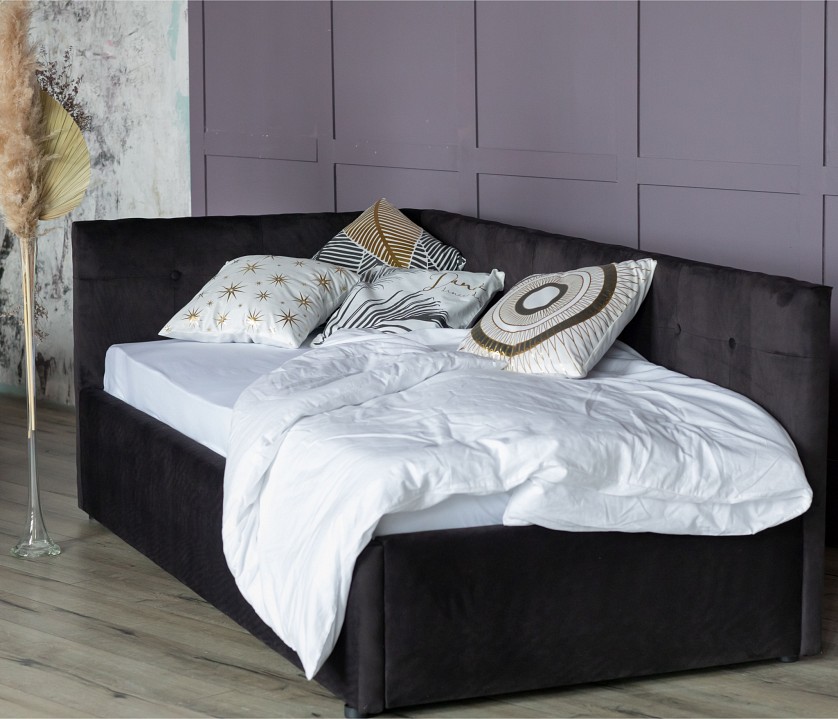 Односпальная кровать Bonna – уникальный предмет мебели, который совмещает в себе полноценную кровать и диван. Кровать с двумя мягкими спинками выполнена из модной мебельной ткани – велюр. Ткань износостойкая, легко чистится от загрязнений, практичная, эластичная, устойчивая к ультрафиолету. Рельефные спинки с неглубокими стяжками украшены декоративными пуговицами в тон обивки. Мягкие изголовья позволяют использовать кровать как мягкий диван для отдыха. Подъемный механизм с гнутоклееными ортопедическими основаниями поднимает кровать под углом 45 градусов. Безопасное противоударное скругление в ножной спинке является весьма актуальным и взрослым и детям. Кровать с подъемным механизмом создает дополнительное место для хранения постельного белья и вещей не первой необходимости, экономит пространство в спальне. Гарантия на металлическую рамку 10 лет. Газлифты повышенной мощности позволяют поднимать и опускать ортопедическую рамку с матрасом без всяких усилий. Передняя часть кровати предназначена для хранения постельных принадлежностей, закрывается противопыльным матерчатым коробом из плотного спанбонда. Матерчатый короб фиксируется в подматрасном пространстве с помощью системы ленты-липучки 'HOOK&LOОP'. Задняя стенка изголовья обшита спандбондом. Кровать поставляется в разобранном виде. Требуется дополнительная сборка. Кровать укомплектована ортопедическим матрасом Promo B Cocos.