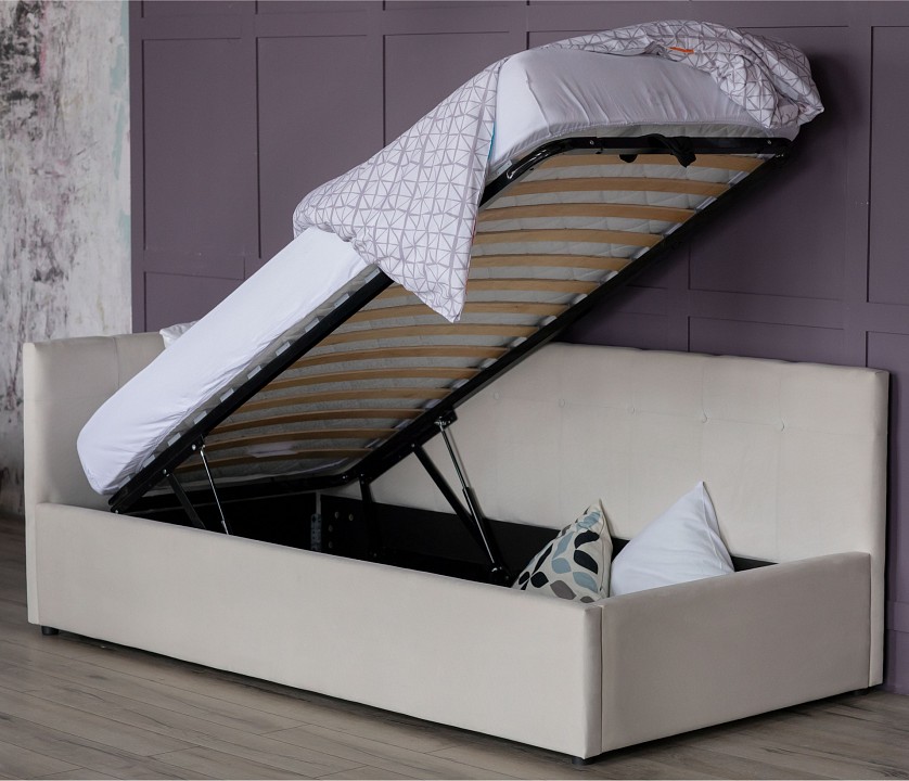 Односпальная кровать Bonna – уникальный предмет мебели, который совмещает в себе полноценную кровать и диван. Кровать с двумя мягкими спинками выполнена из модной мебельной ткани – велюр. Ткань износостойкая, легко чистится от загрязнений, практичная, эластичная, устойчивая к ультрафиолету. Рельефные спинки с неглубокими стяжками украшены декоративными пуговицами в тон обивки. Мягкие изголовья позволяют использовать кровать как мягкий диван для отдыха. Подъемный механизм с гнутоклееными ортопедическими основаниями поднимает кровать под углом 45 градусов. Безопасное противоударное скругление в ножной спинке является весьма актуальным и взрослым и детям. Кровать с подъемным механизмом создает дополнительное место для хранения постельного белья и вещей не первой необходимости, экономит пространство в спальне. Гарантия на металлическую рамку 10 лет. Газлифты повышенной мощности позволяют поднимать и опускать ортопедическую рамку с матрасом без всяких усилий. Передняя часть кровати предназначена для хранения постельных принадлежностей, закрывается противопыльным матерчатым коробом из плотного спанбонда. Матерчатый короб фиксируется в подматрасном пространстве с помощью системы ленты-липучки 'HOOK&LOОP'. Задняя стенка изголовья обшита спандбондом. Кровать поставляется в разобранном виде. Требуется дополнительная сборка. Кровать укомплектована ортопедическим матрасом Promo B Cocos.