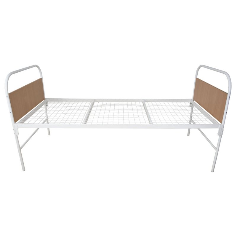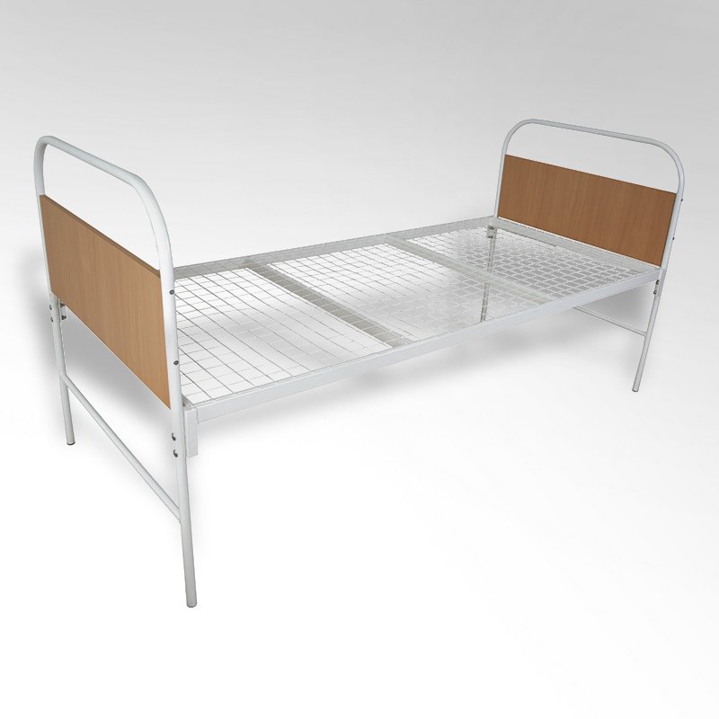 Кровать изготовлена из металлического профиля и трубы. Вставки на спинке выполнены из ЛДСП. Ложе кровати имеет панцирное плетение, что обеспечивает надежное расположение матраса и пациента.