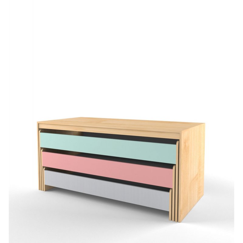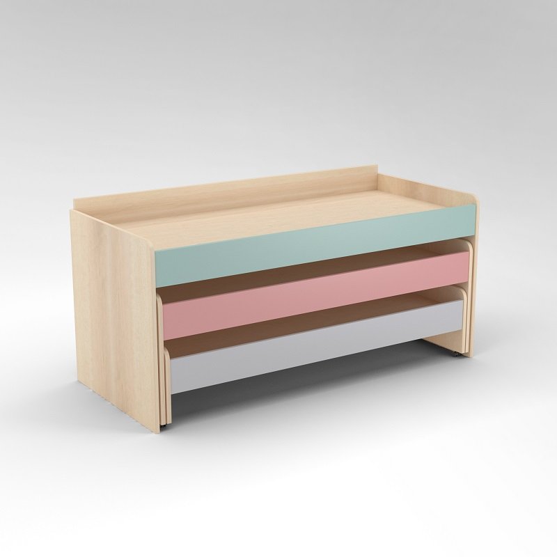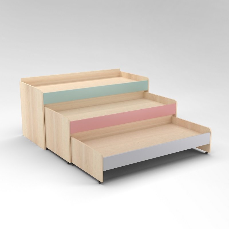 Многоярусная кровать станет незаменимым предметом спальной зоны в детском саду. Благодаря выкатной конструкции значительно экономится пространство помещения. Кровать изготавливается из ЛДСП, ложе из фанеры. Все края ЛДСП покрыты противоударной кромкой ПВХ, в комплект входит тумба.