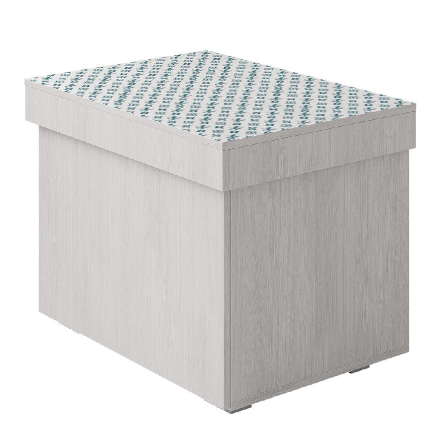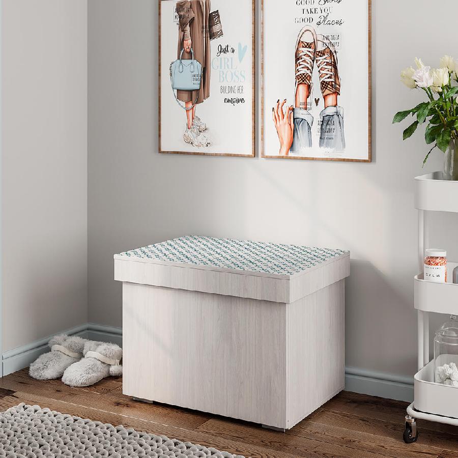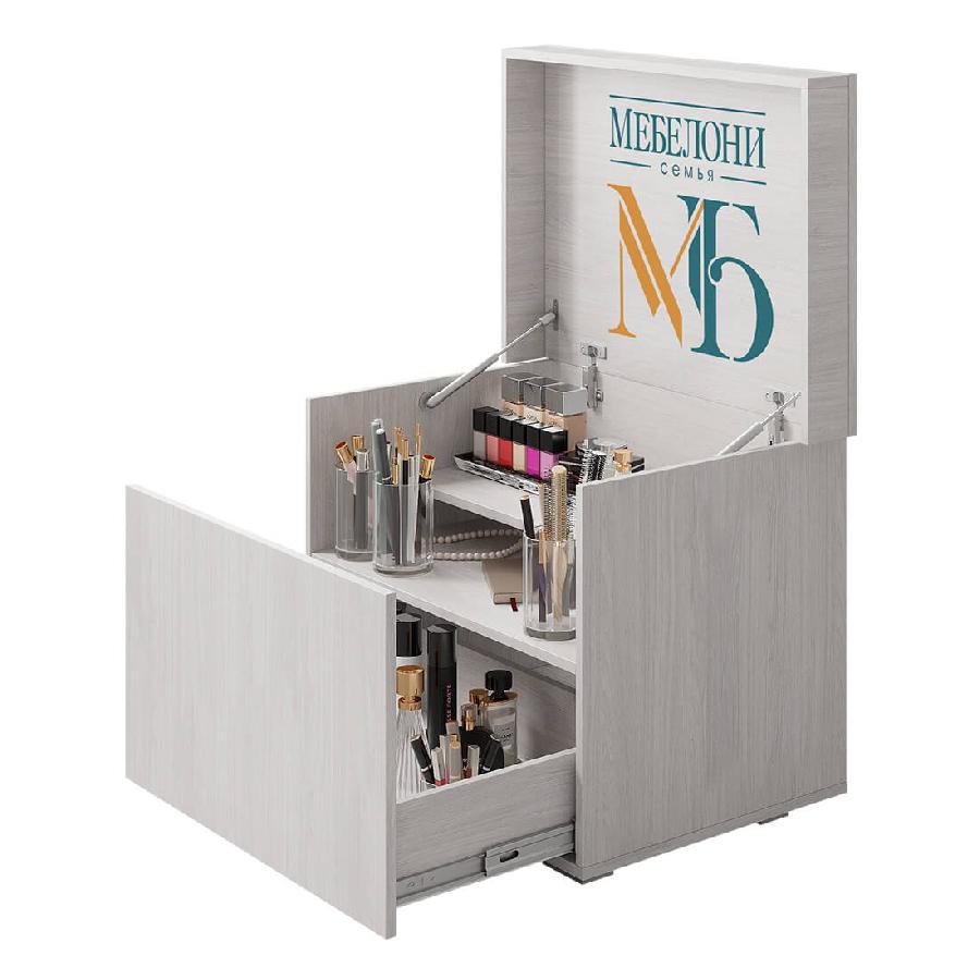 Крышка тумбы, на которую фотопечатью нанесён фирменный паттерн, плавно открывается при помощи механизма газлифт.