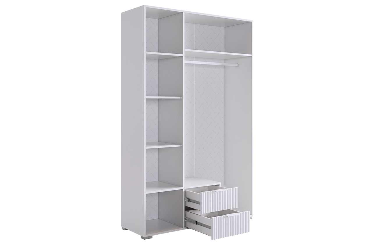 Габариты 1200х422х1900 мм обеспечат достаточное пространство для хранения одежды, белья и других предметов, а стильные и спокойные цвета шкафа придают ему шарм и изысканность. Корпус шкафа изготовлен из ЛДСП в цвете белое дерево, что придаст помещению светлую и уютную атмосферу. Фасады распашных дверей выполнены из ЛДСП в цвете белое дерево. Фасады выкатных ящиков выполнены из МДФ, покрытие эмаль. Вертикальные полосы на фасаде создают особую изысканность и стильный акцент, добавляя глубины пространству. Фрезеровка в виде вертикальных полос на фасадах выкатных ящиков создает интересный и стильный акцент.