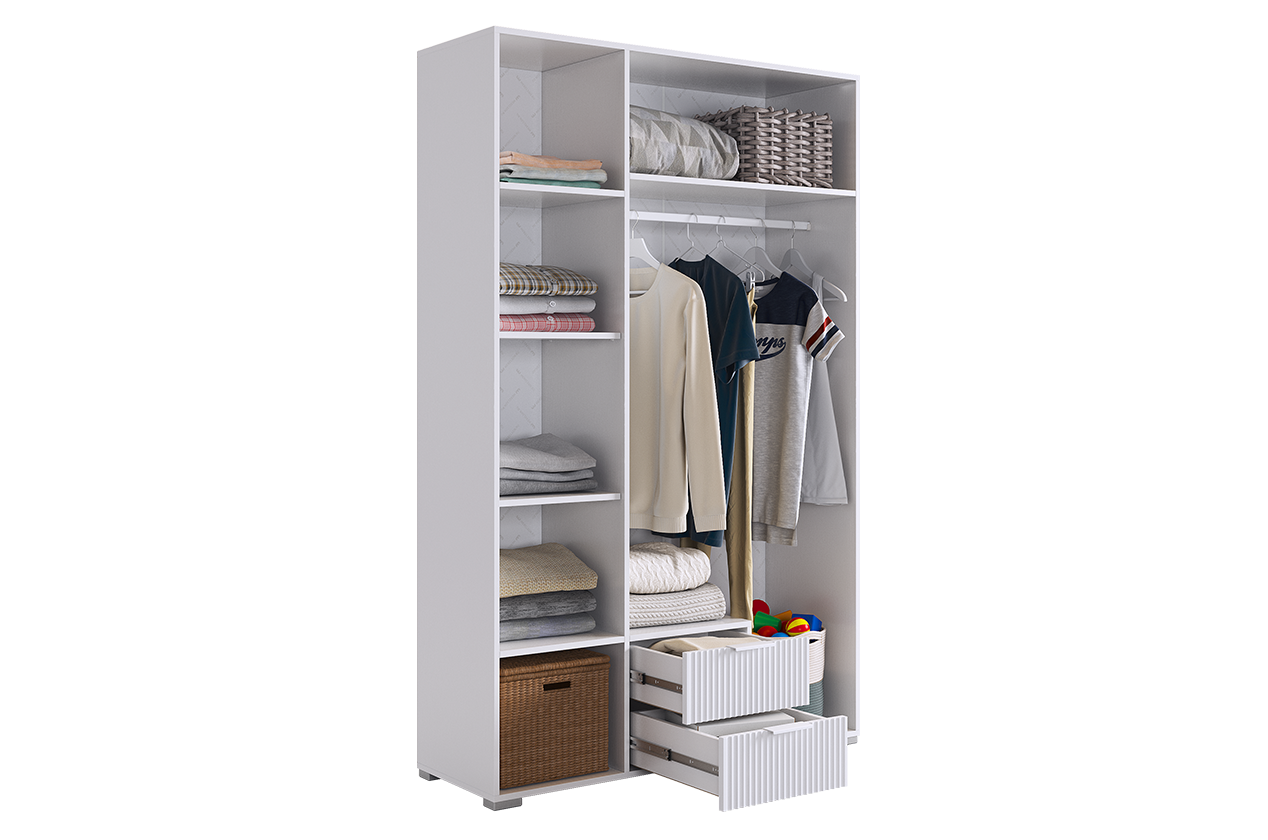 Универсальная сборка позволяет легко и быстро монтировать шкаф "Зефир". Две секции - одна с штангой и двумя полками, а вторая с пятью полками - обеспечивают удобство и легкость в хранении ваших вещей.