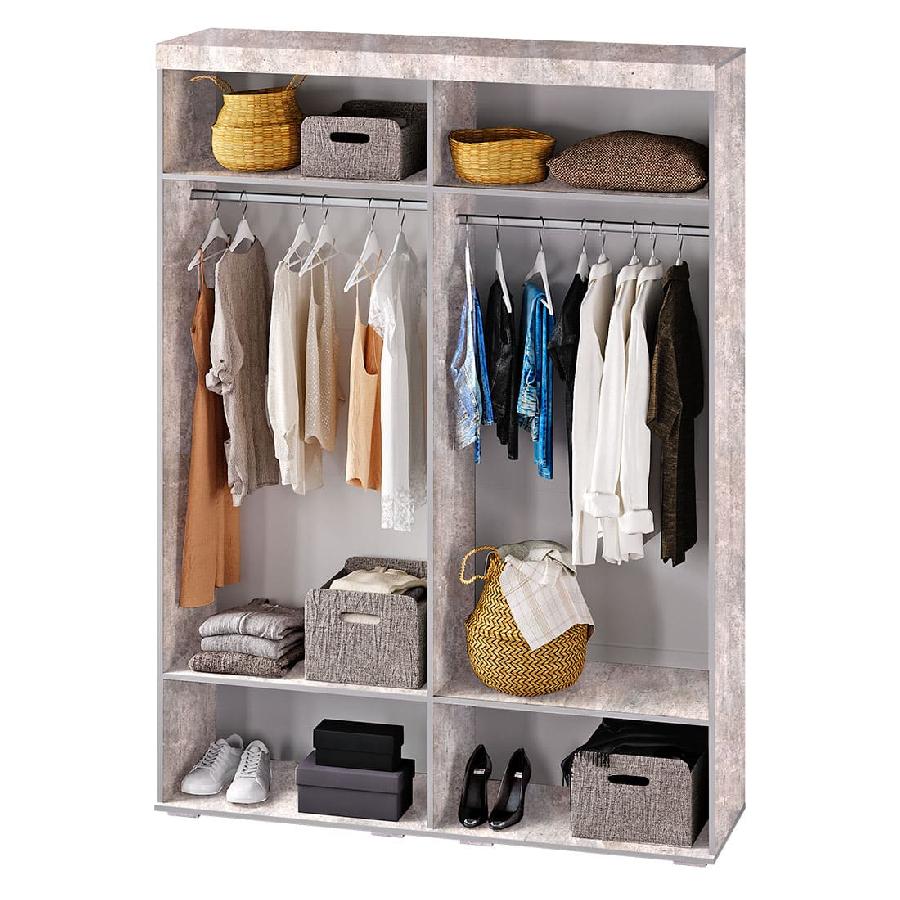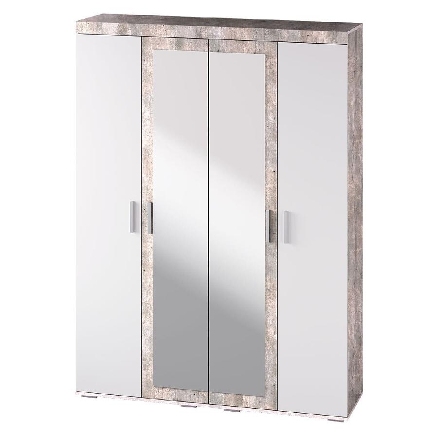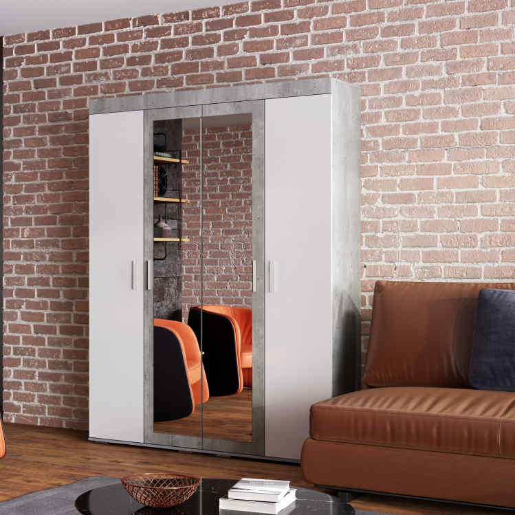 Модель состоит из четырех дверок, две из которых - зеркальные, изделие выполнено в комбинации белого цвета и цвета метрополитан грей, внутреннее наполнение состоит из двух отделений со штангами, а также верхних и нижних полок для вещей, стильные геометрические ручки украшают шкаф.