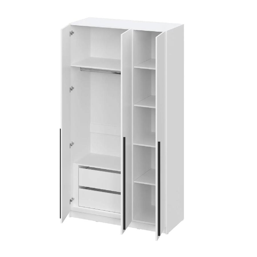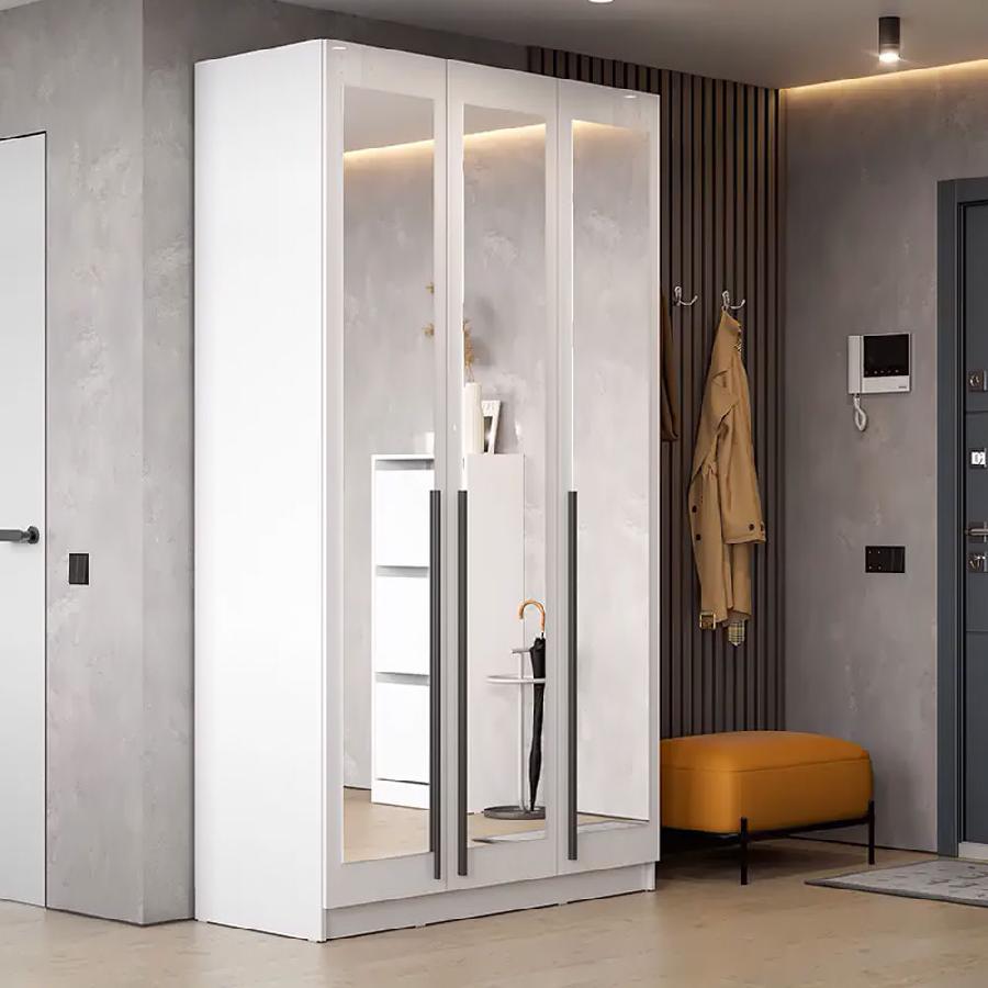 Трехстворчатый шкаф имеет универсальный вариант для хранения: на полках и в выдвижных ящиках можно разместить нижнее белье, одежду, постельное белье, а на горизонтальной штанге развесить одежду на вешалках. Сочетание платяного и бельевого отсеков позволяет использовать шкаф в качестве комбинированного.