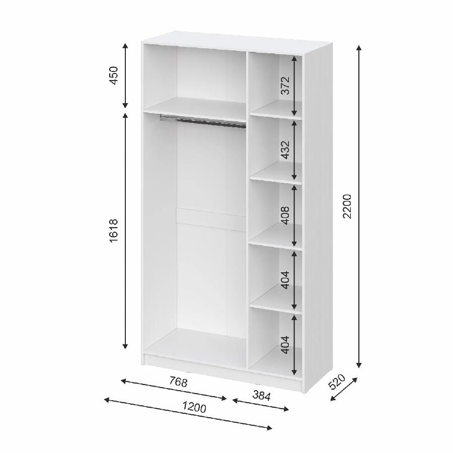 Размеры шкафа: ширина – 120 см, высота – 220 см, глубина – 52 см. Длина ручки – 1024 мм каждая. Габариты отделения с ящиками: 768х500х430 мм.