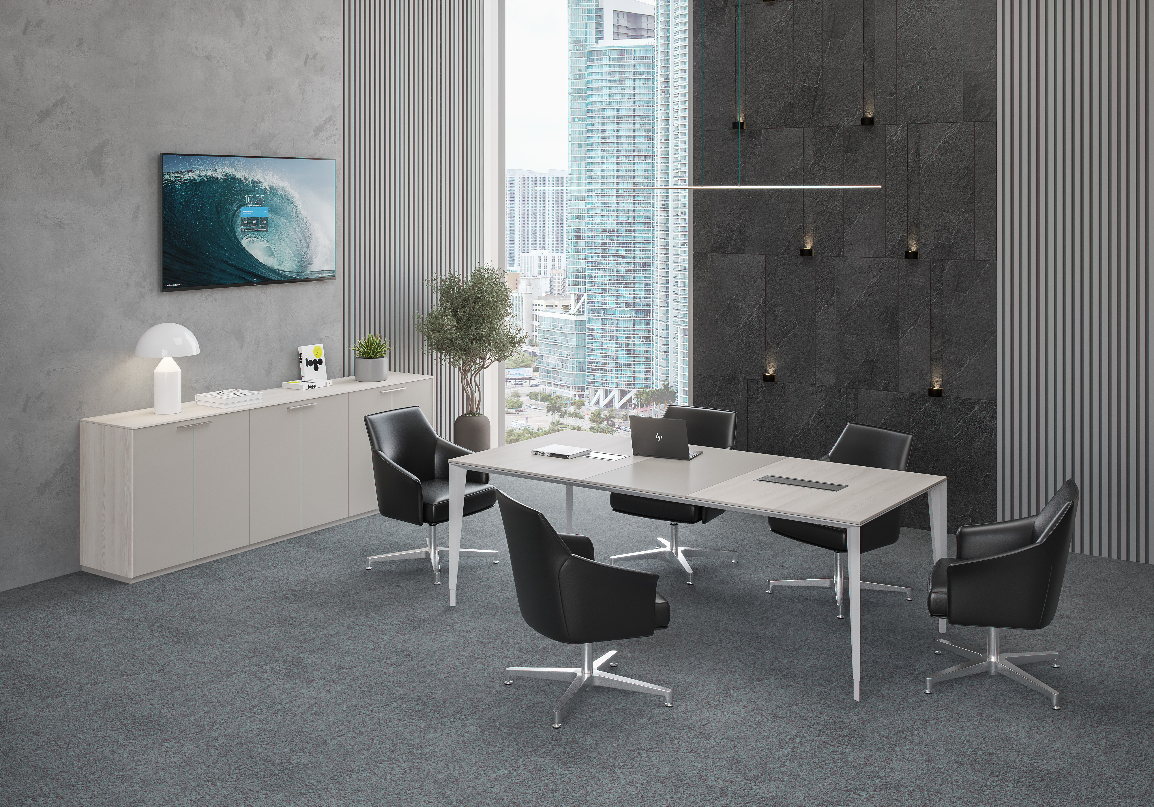 Столы для переговоров были созданы с учетом современных мультимедийных конференц‐залов. Благодаря возможностям добавления центральных элементов (кабель‐каналов), обеспечивающих безопасную и элегантную проводку, мы получаем эстетичный, но, прежде всего, эргономичный рабочий стол для общения.