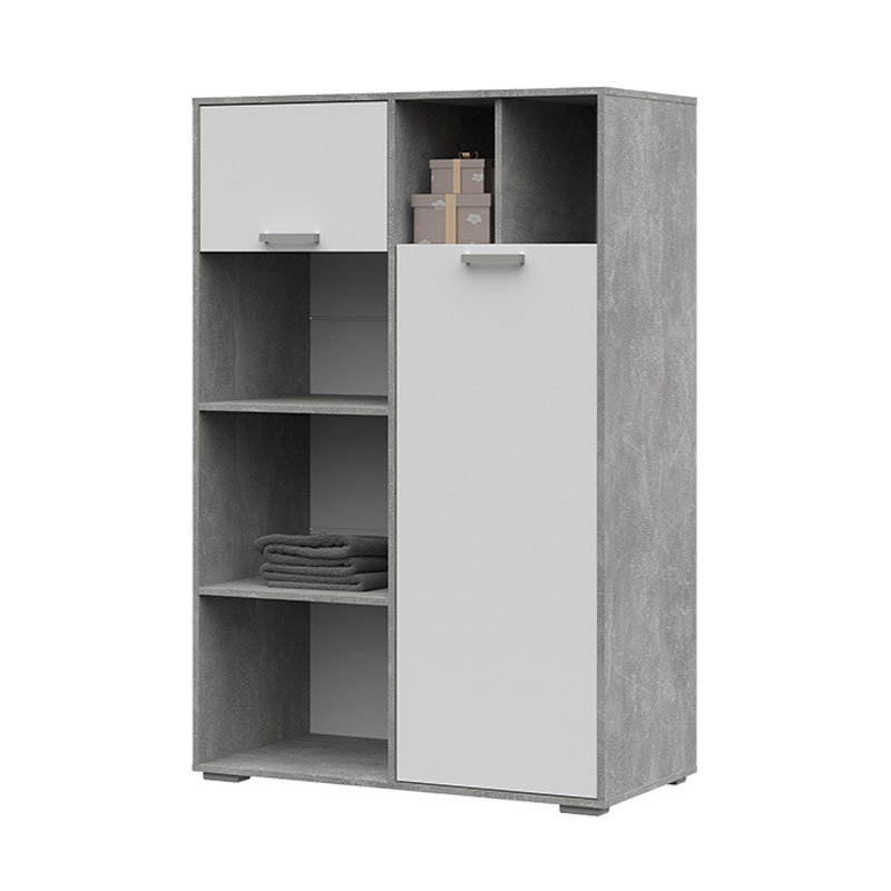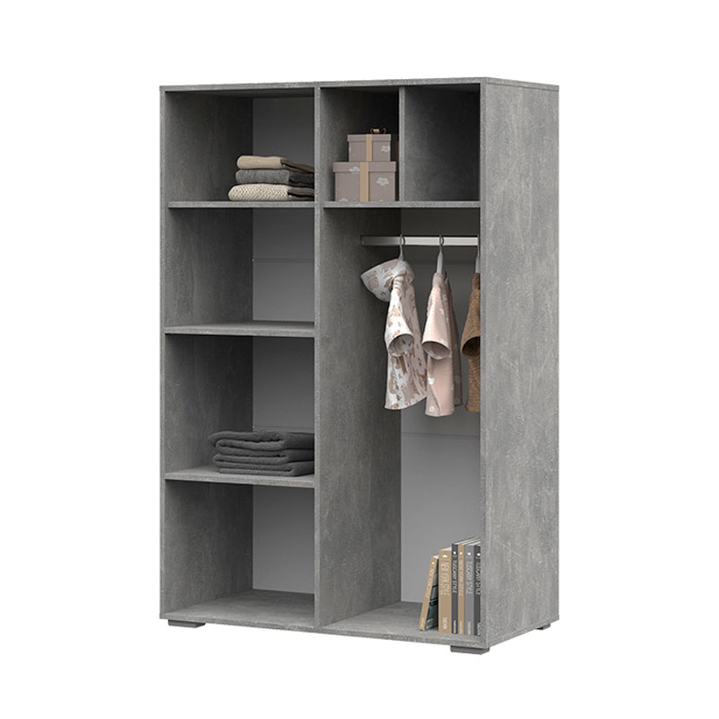 Дизайн этого невысокого шкафа Денвер ШК03 определен общими чертами серии и выполнен в том же светлом тоне сдержанных оттенков. Комбинированная конструкция шкафа отлично подходит для организации хранения вещей, белья и одежды: у него есть и открытые полки, и скрытая створкой ниша, и платяная секция со стационарной штангой для плечиков с одеждой.