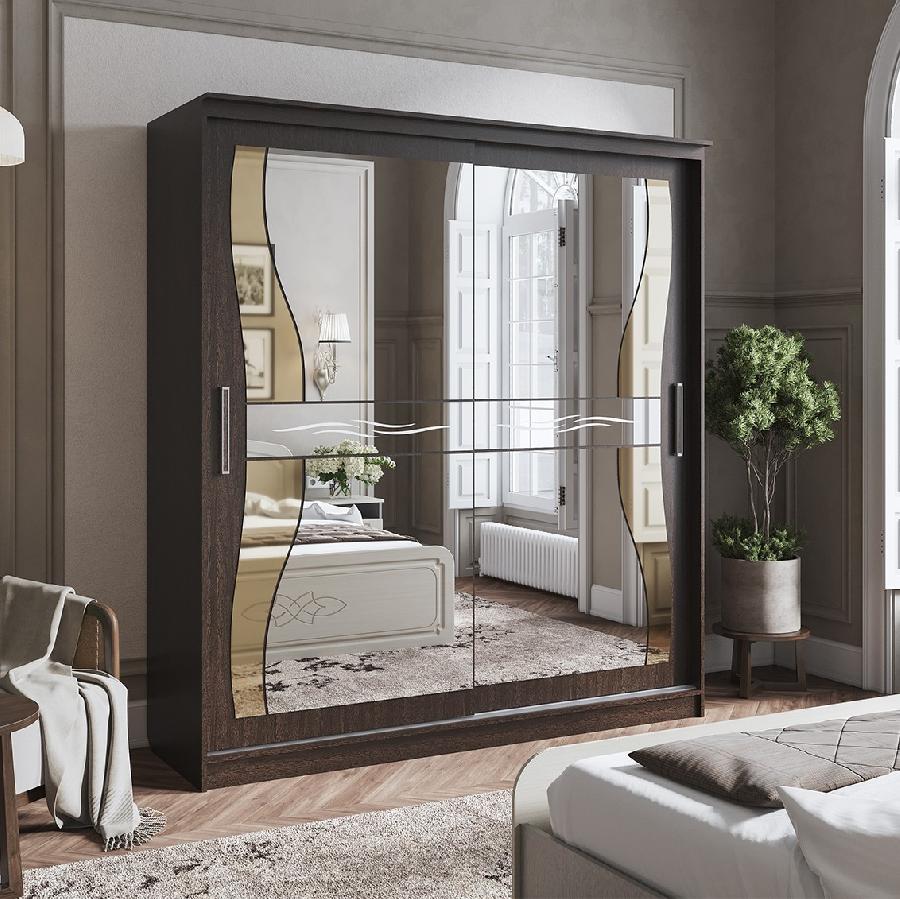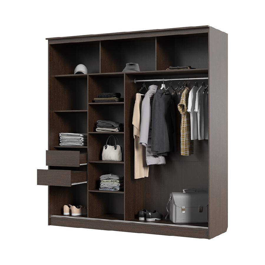 Шкаф декорирован большим зеркалом на фасаде, имеет множество полок, выдвижных ящиков и штангу для хранения Ваших вещей.
