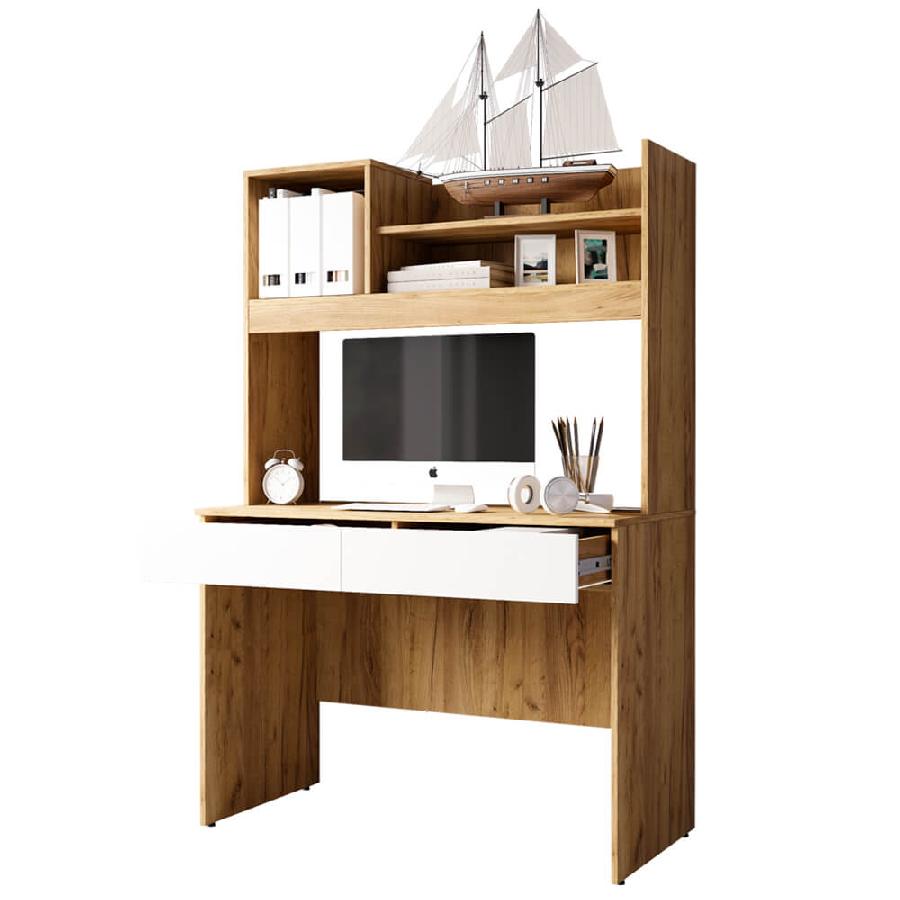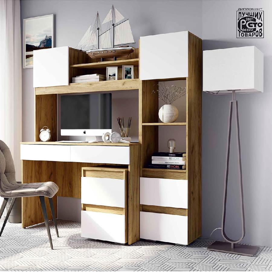 Модель выполнена в цвете крафт в гармоничном сочетании с белым глянцем, в выдвижных ящиках и нишах над столешницей получится разместить все необходимые для работы или учебы вещи.