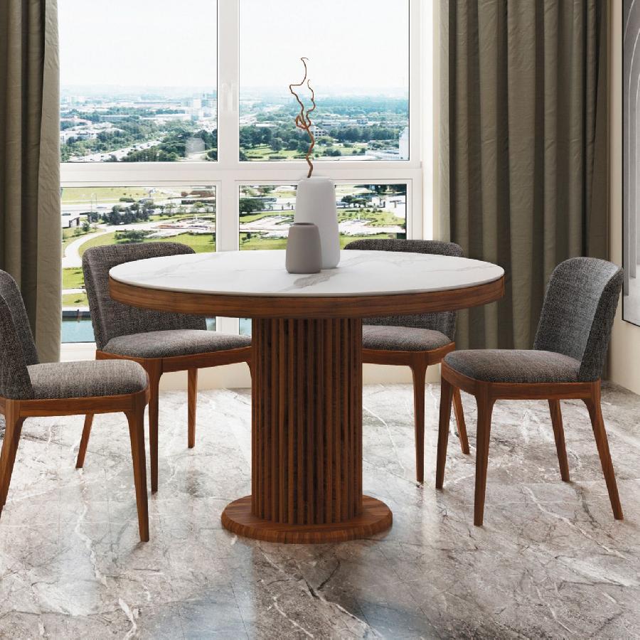 Стол Denver оснащен круглой нераскладывающейся столешницей, выполненной из матовой керамики толщиной 6 мм, что обеспечивает прочность и устойчивость к царапинам и пятнам.
