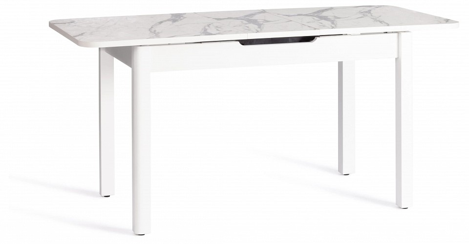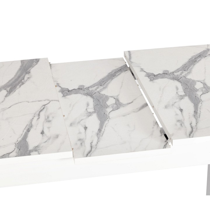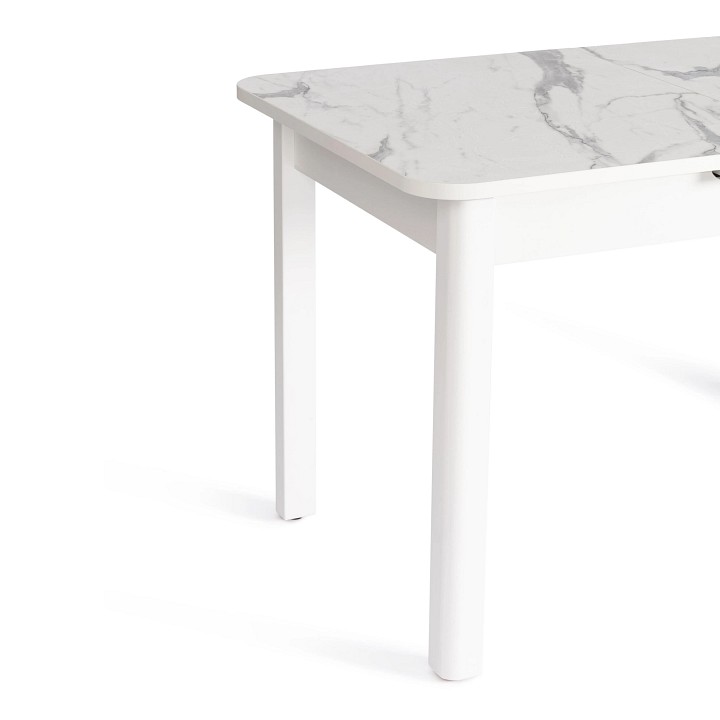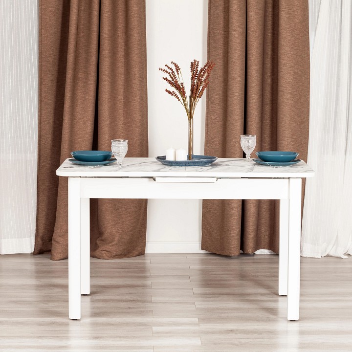 Раскладной стол ALIGERY из коллекции Modern сделает оригинальным и узнаваемым интерьер загородного дома или городской квартиры. Стол подойдёт для гостиной, кухни или столовой. Столешница цвета мрамор светлый и вставка выполнены из ЛДСП толщиной 22 мм на лицевую поверхность которых нанесен защитный слой HPL толщиной 1 мм. HPL имеет защитное покрытие оверлей высокой степени истирания, которое повышает устойчивость поверхностей к повреждениям. Структурированная поверхность столлешницы с имитацией натурального камня придает изыканный вид. Используется кромка ПВХ 2 мм. Для увеличения размера стола используется автоматический механизм подъема вставки стола. Прочные белые ножки из массива березы, окрашены. Ножки стола регулируются по высоте для устранения неровности пола с помощью регулировочных винтов. Во избежании самопроизвольного раздвижения половинок столешниц обязательно переключайте фиксаторы в режим 'Закрыто'. Уникальная модель впечатлит своей прочностью, простотой в уходе и долговечностью, придаст помещению элегантность, изысканность и акцентирует внимание гостей на обеденной зоне. За столом могут разместиться от 2 до 6 человек. Стол упакован в транспортировочный короб из ЛДСП + гофрокороб. Модель проста в сборке, инструкция по сборке прилагается.