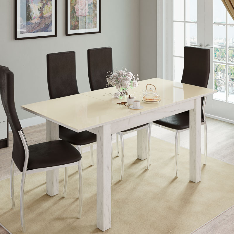 Все столешницы выполнены из ЛДСП и покрыты стеклом с декором. Столешницы имеют скруглённые углы и размерный ряд (для всех столов серии Норман и для столов серии Бруно в сложенном виде): 1000х600