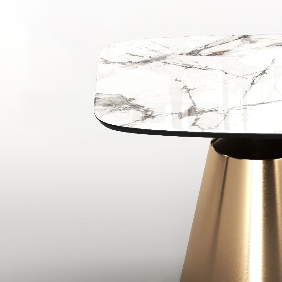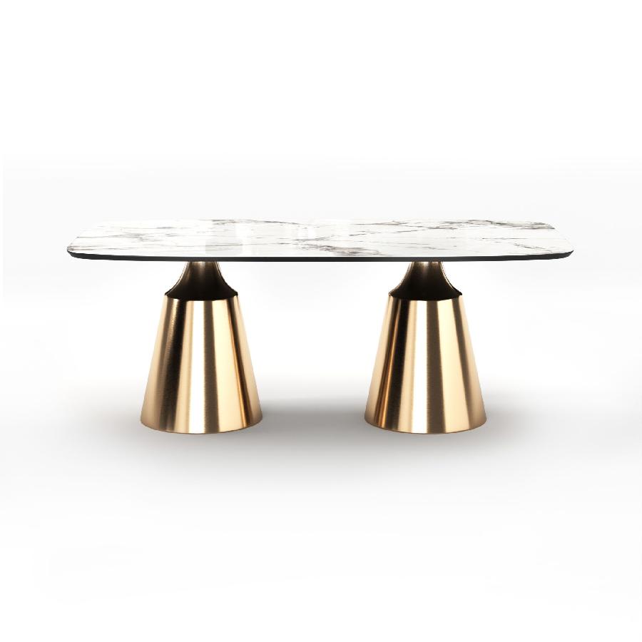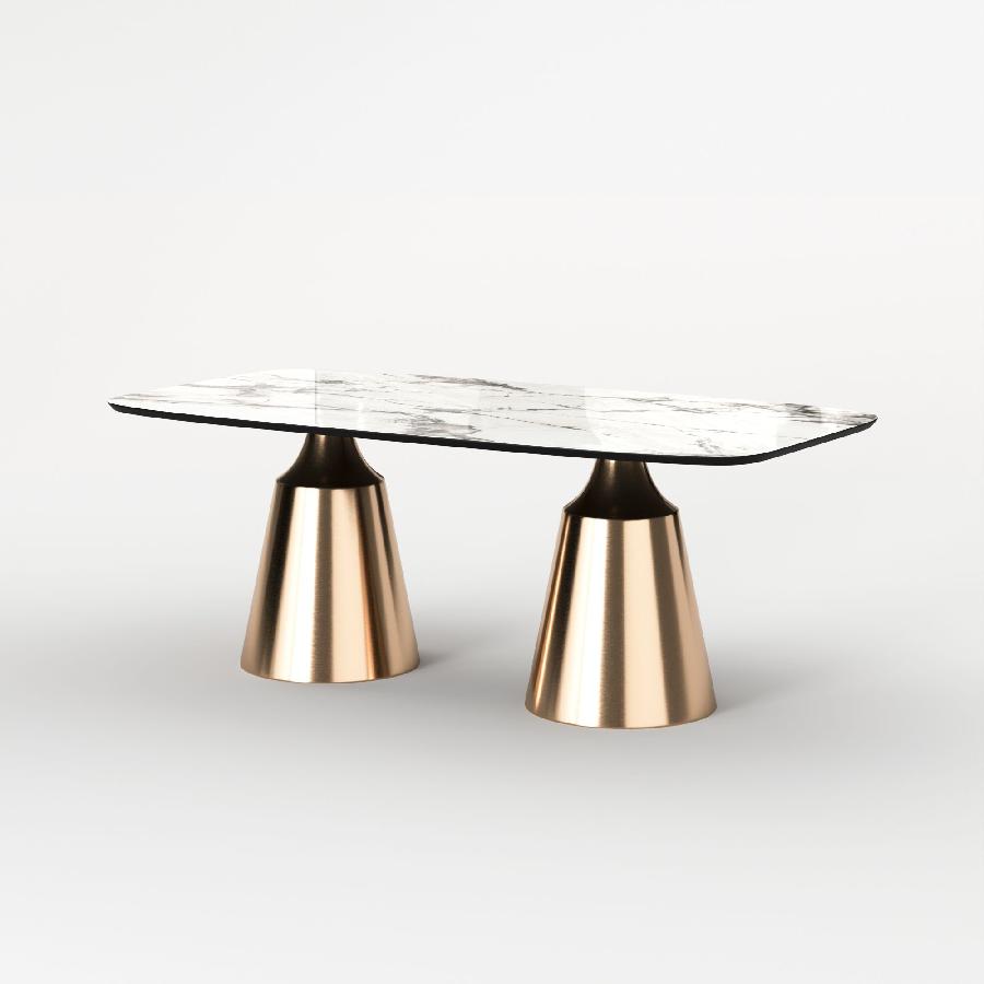 Основание состоит из центрального конусного ствола, выполненного из нержавеющей стали, массивный внешний вид которого облегчается металлическим покрытием нитрид титана цвет золото и соединением с узкой и отступающей столешницей, как бы напоминающей длинную элегантную шею, поддерживающую столешницу. Коллекция включает круглый, овальный, прямоугольный керамический стол Lucas с матовым или глянцевым покрытием и версию со столешницей из шпона.