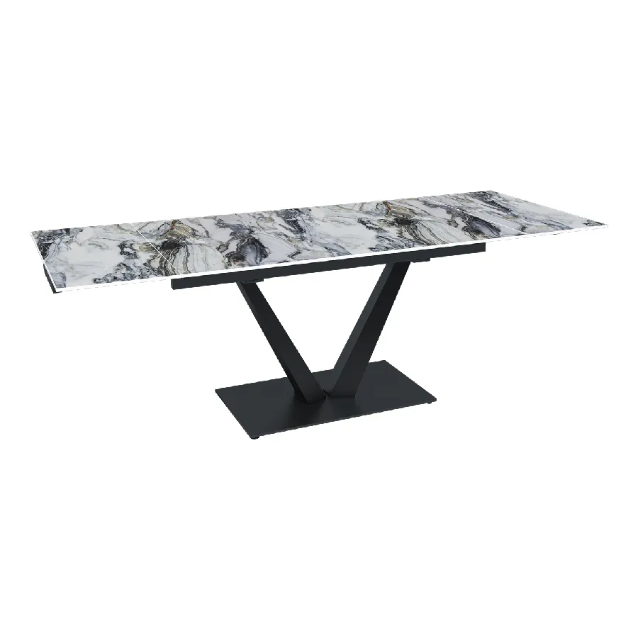 Стол с керамической столешницей «Malibu» представляет собой изысканное и функциональное обеденное место для вашего дома. Поверхность столешницы, выполненная из керамики, обеспечивает прочность, легкость в уходе и устойчивость к царапинам и температурным изменениям. Стильное металлическое основание дарит стабильность и надежность, дополняя современный дизайн стола. Данный стол идеально подходит для семейных обедов и встреч с друзьями, создавая уютную и стильную обстановку в вашем доме. Столешница модели «Malibu» может быть как компактной по площади так и просторной благодаря наличию механизма трансформации.
