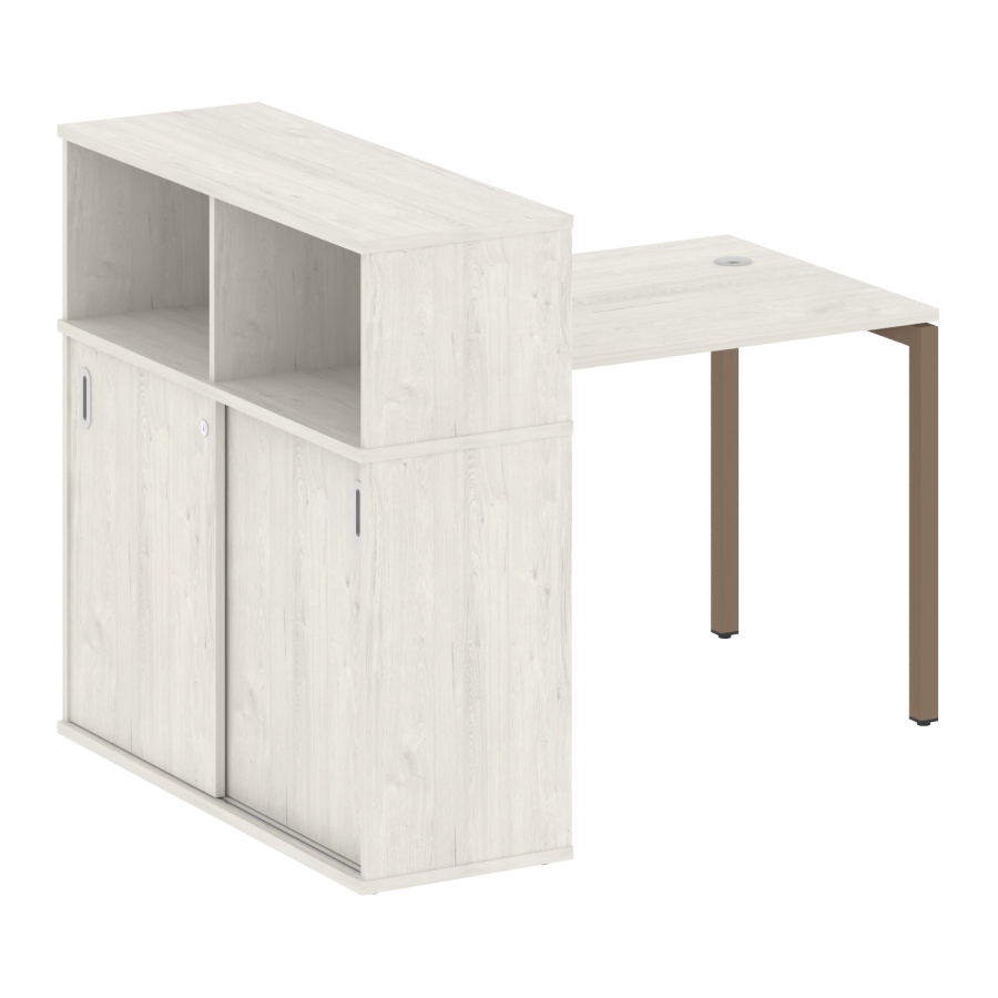 Столешницы имеют отверстия с пластиковыми заглушками кабель-канала серого цвета.