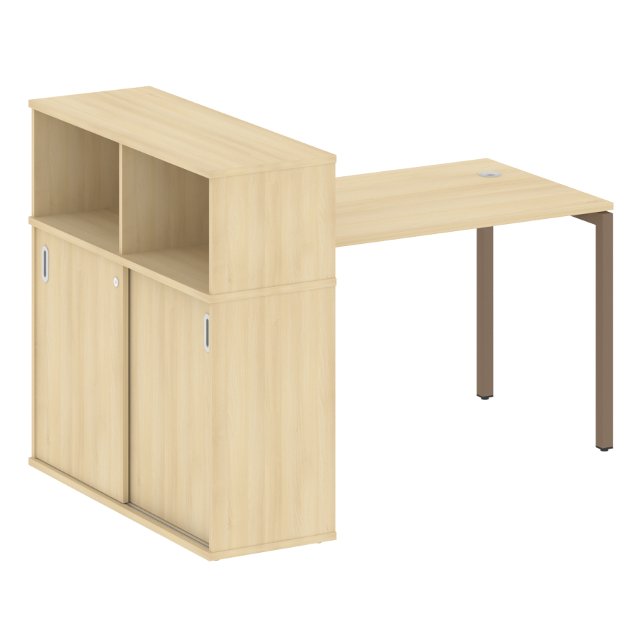 Столешницы имеют отверстия с пластиковыми заглушками кабель-канала серого цвета.