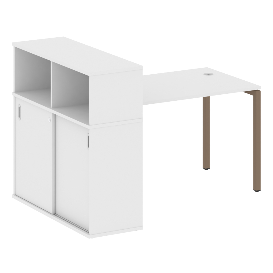 Столешницы имеют отверстия с пластиковыми заглушками кабель-канала серого цвета.