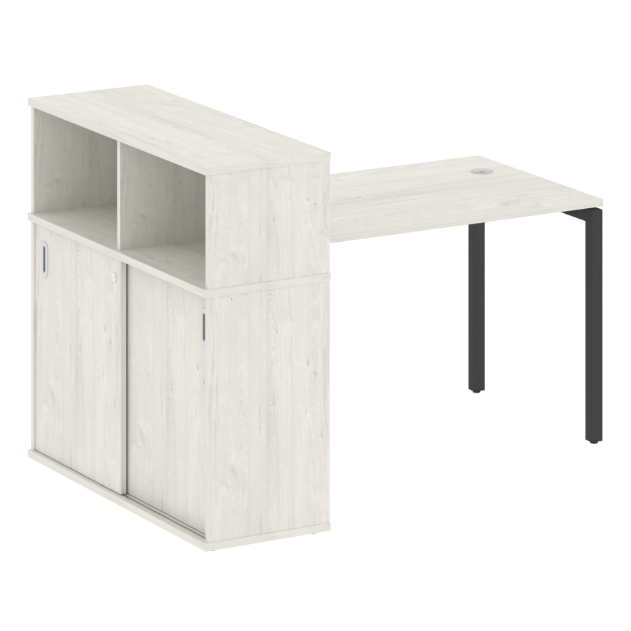 Столешницы имеют отверстия с пластиковыми заглушками кабель-канала серого цвета.