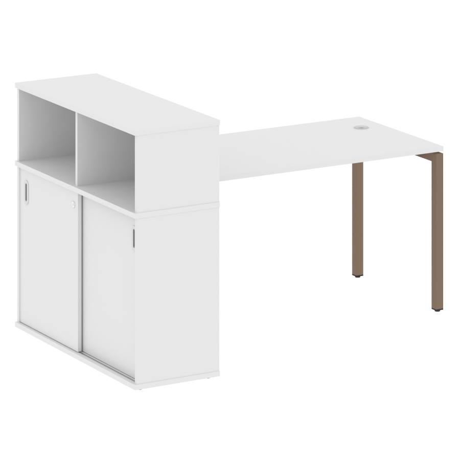 Столешницы имеют отверстия с пластиковыми заглушками кабель-канала серого цвета.