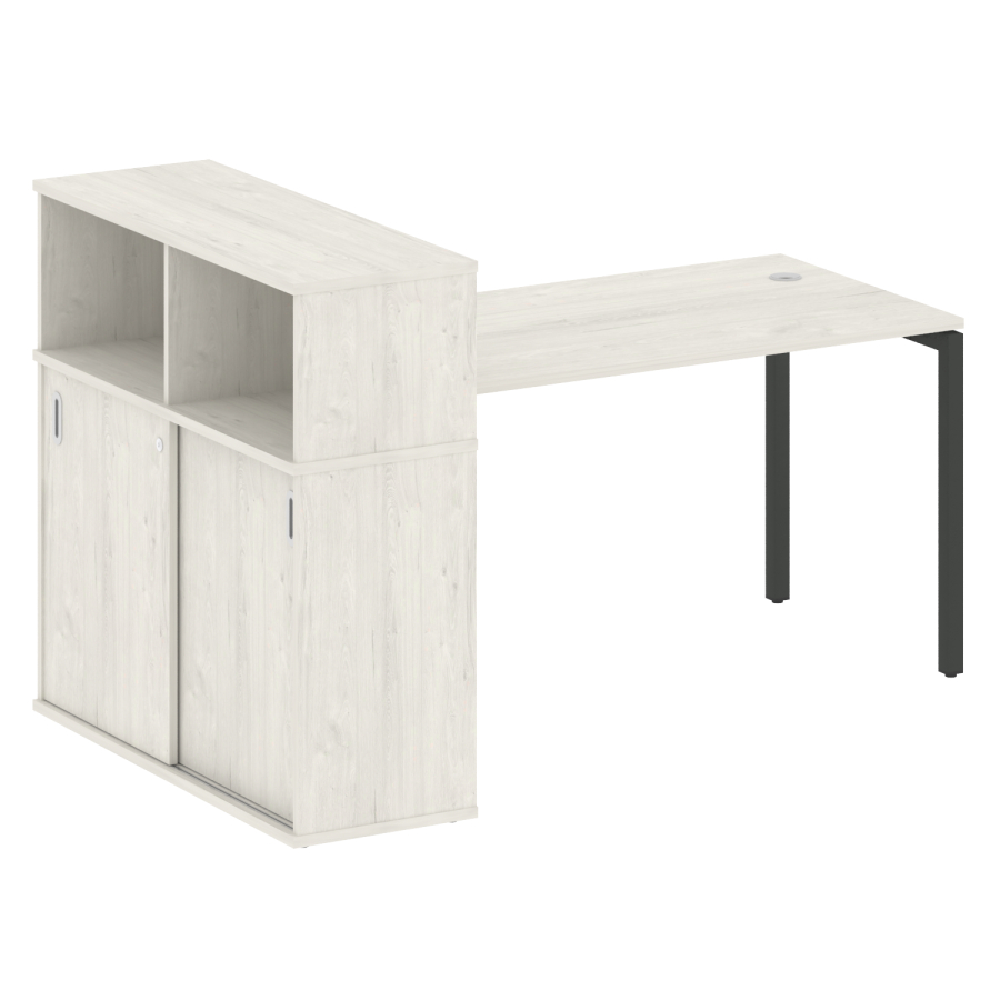Столешницы имеют отверстия с пластиковыми заглушками кабель-канала серого цвета.
