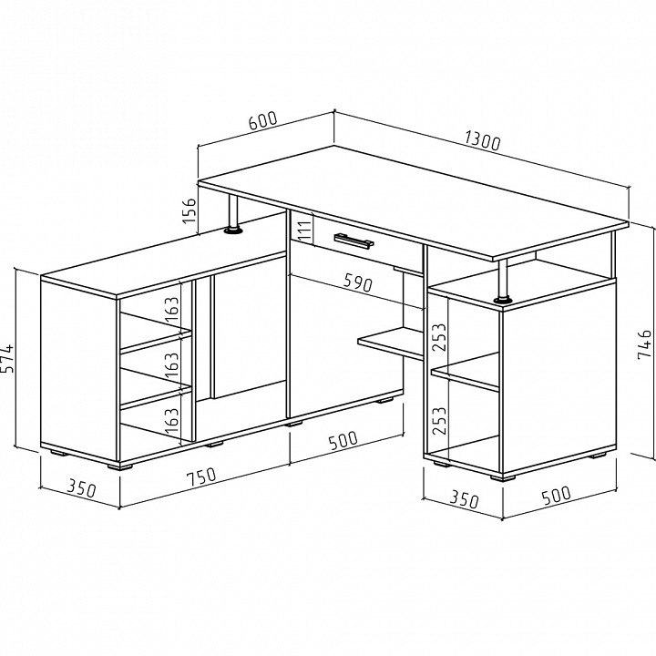 Компоненты, входящие в комплект: 1 полка, 1 ящик, тумба: 2 полки, тумбочка: 1 дверца, 1 полка.