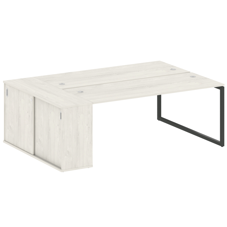 Столешницы имеют отверстия с пластиковыми заглушками кабель-канала серого цвета.