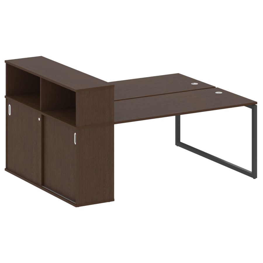 Столешницы имеют отверстия с пластиковыми заглушками кабель-канала серого цвета.
