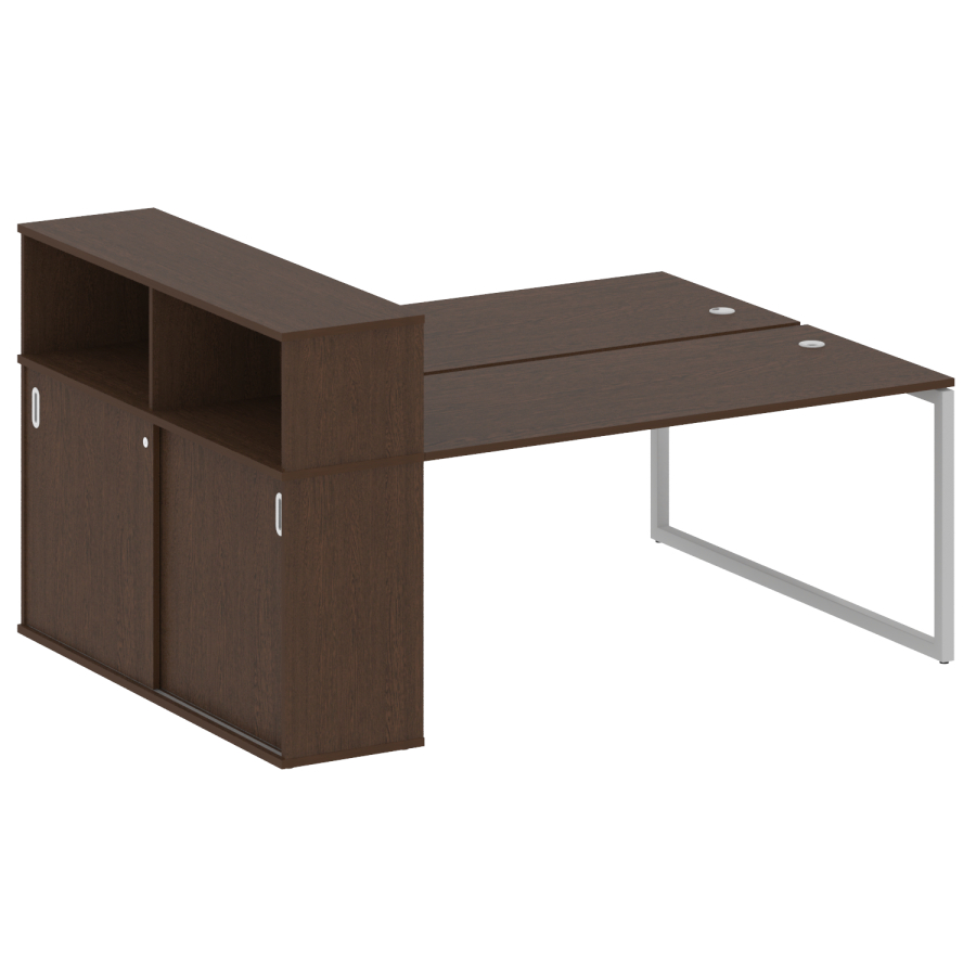 Столешницы имеют отверстия с пластиковыми заглушками кабель-канала серого цвета.